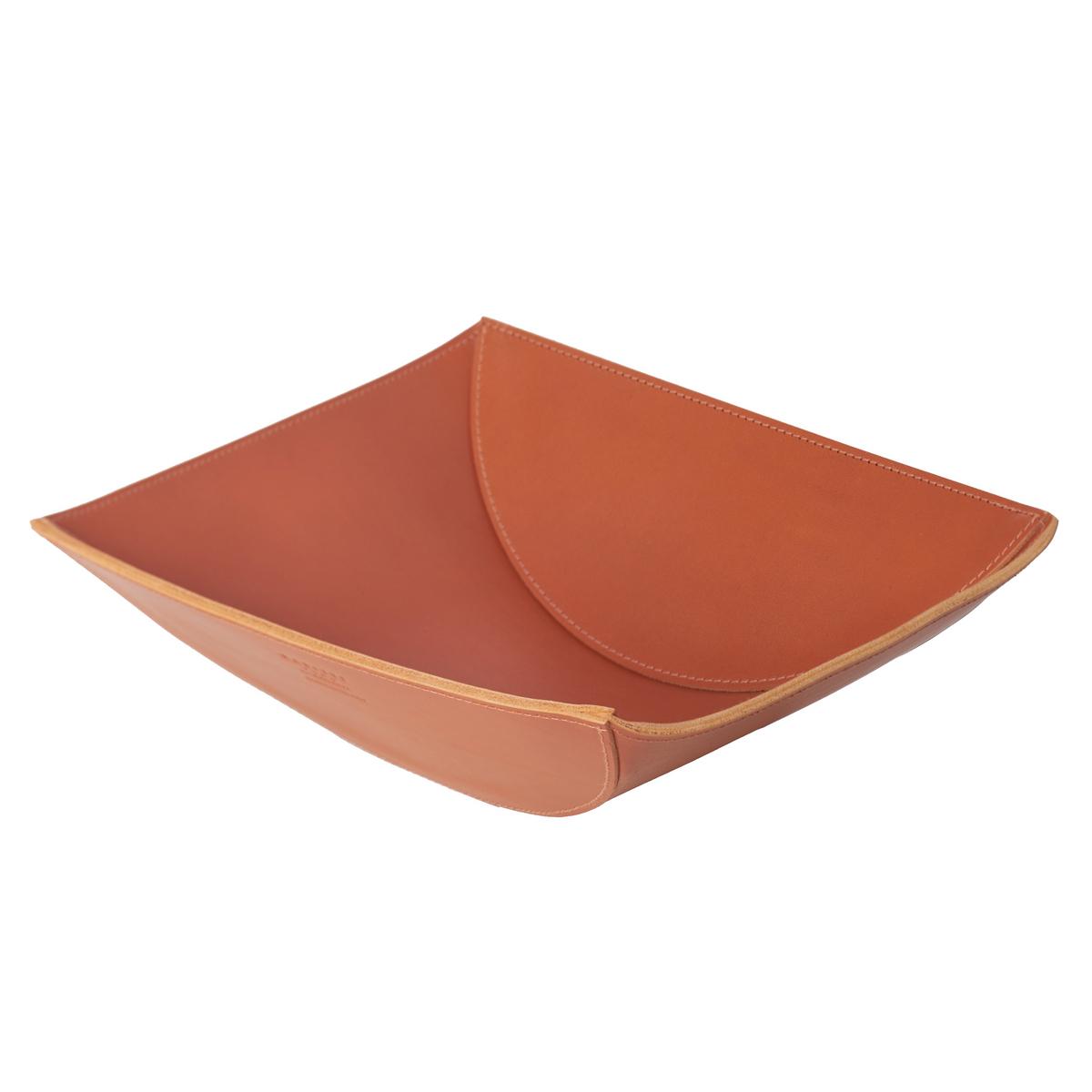 Handwerkskunst gepaart mit italienischem Design: Die von Hand vernähte Lederschale "Lambda" wird in verschiedenen Farben angeboten und bietet eine elegante Möglichkeit, Briefe oder Schlüssel abzulegen.