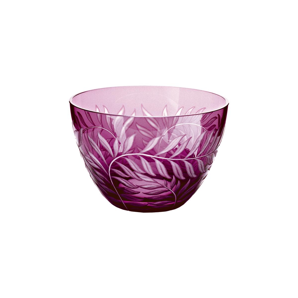 Die Schalen "Feuilles" verdanken ihren Namen den kunstvollen Blätterranken, mit denen sie graviert sind. Die Glaskünstler von Theresienthal gravieren in reiner Handarbeit die kunstvollen Schalen mit dem Blättermotiv. Der Reiz der Schalen liegt in dem "zweischichtigen" Kristallglas. Für die Gravur wird die äußere, sehr dünne farbige Glasschicht "durchschnitten" und damit die untere, klare Glasschicht freigelegt. Dadurch wirkt die kunstvolle Gravur besonders leicht und hebt sich deutlich vom farbigen Glas ab. Diese feine Gravur ist es, die das Kristallglas so wertvoll macht.
