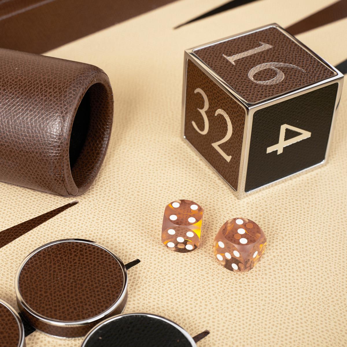 Der Verdoppelungswürfel hat neben dem edlen Kalbsleder-Bezug, polierte Nickel-Ränder und silbern glänzende Zahlen.