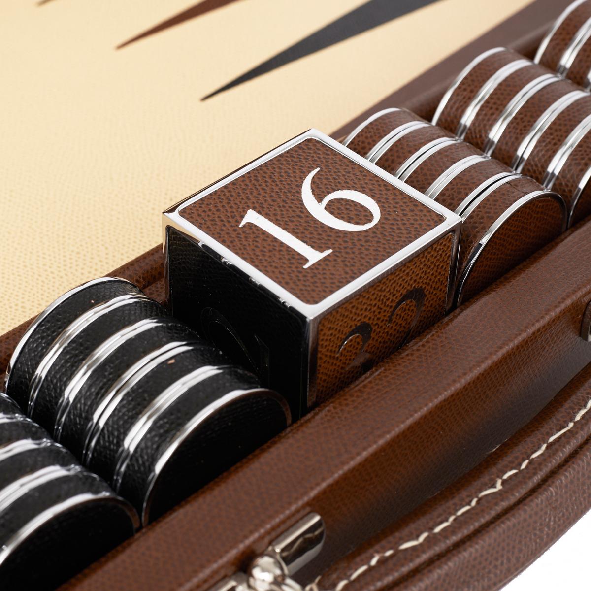 Sogar jeder einzelne Spielstein gleicht einem Schmuckstück: Mit Lederbezogenen Seiten und auf Hochglanz polierten Nickel-Rändern.