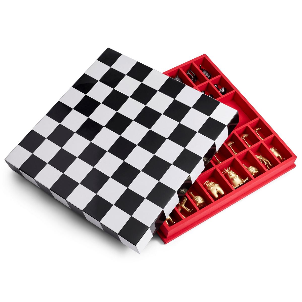 Die witzigen Figuren beim Schachspiel "Haas" bestehen aus Messing und werden individuell angefertigt. Das Schachbrett ist mit Intarsien aus schwarzen und weißen Steinen ausgelegt. Geliefert wird das Strategiespiel in einer hochwertigen L’Objet Geschenkbox.