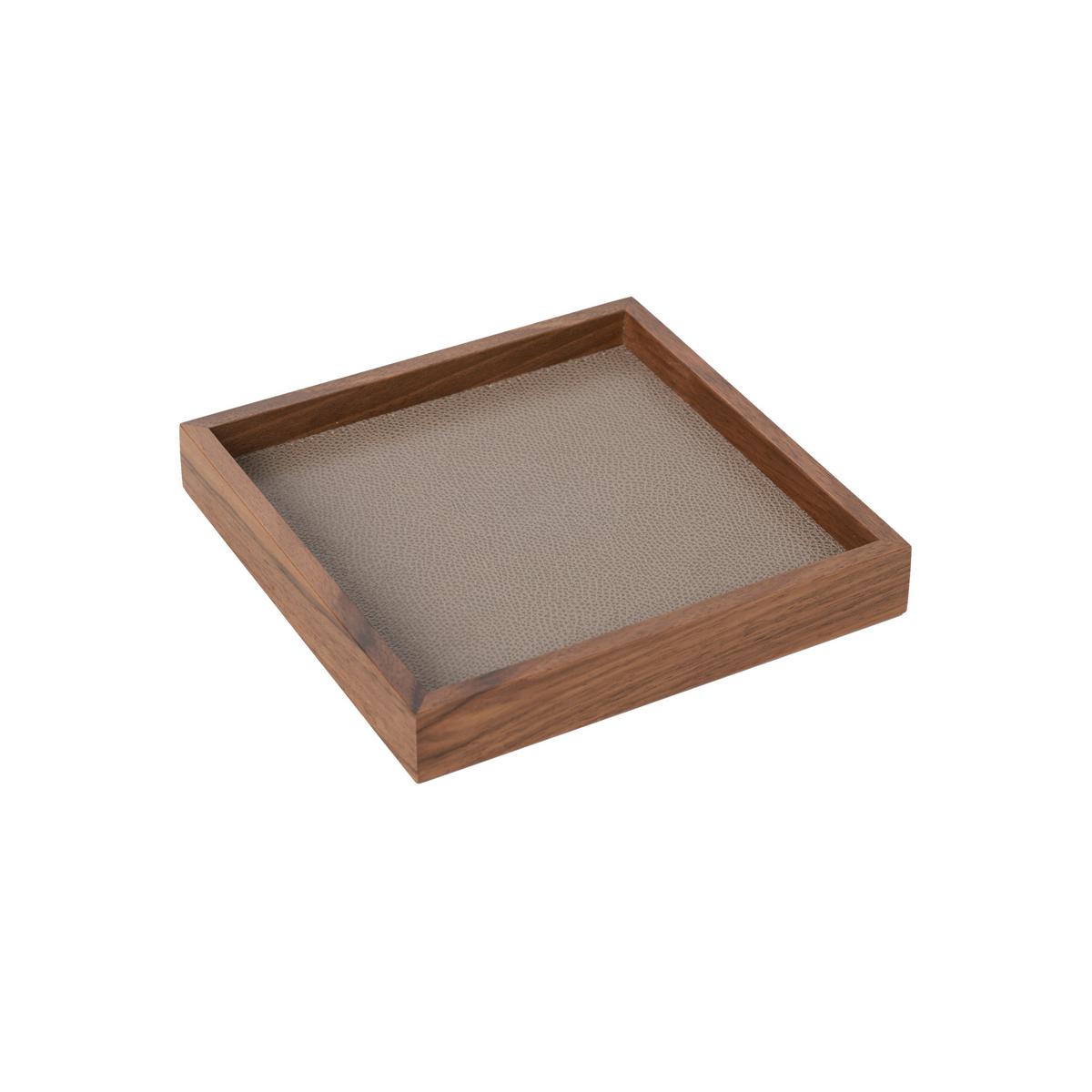 Die Kollektion "Phorma" von GioBagnara spielt mit unterschiedlichen Tablettformen und Tablettgrößen. Wenn auch noch unterschiedliche Lederfarben dazukommen, gibt es schier unendlich viele Kombinationsmöglichkeiten. So passen die kleinen Tabletts perfekt in die großen Tabletts. Zusätzlich entsteht ein dreidimensionaler Effekt, welcher der schönen Holzumrandung mit Walnussholz geschuldet ist.
