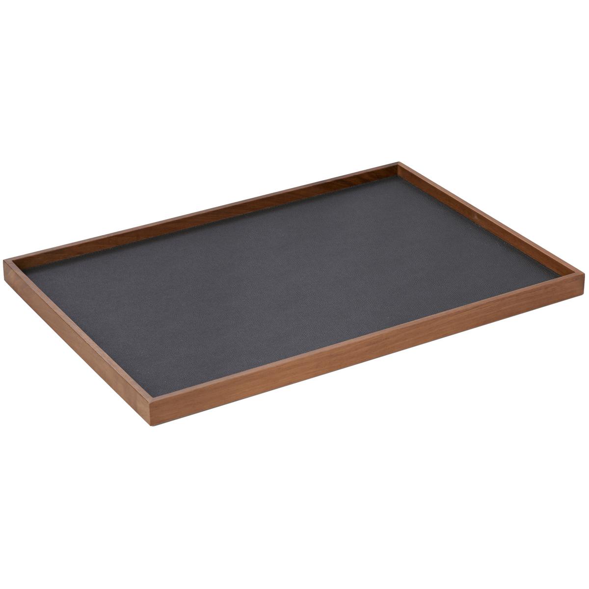 Die Kollektion "Phorma" von GioBagnara spielt mit unterschiedlichen Tablettformen und Tablettgrößen. Wenn auch noch unterschiedliche Lederfarben dazukommen, gibt es schier unendlich viele Kombinationsmöglichkeiten. So passen die kleinen Tabletts perfekt in die großen Tabletts. Zusätzlich entsteht ein dreidimensionaler Effekt, welcher der schönen Holzumrandung mit Walnussholz geschuldet ist.