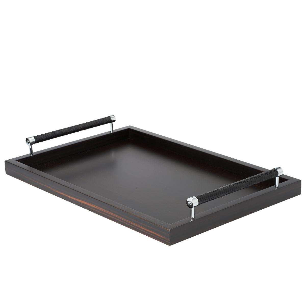 Das Tablett "Macassar" von Riviere zieht mit der wunderschönen Maserung des eleganten Macassarholzes die Blicke auf sich. Die verchromten Griffen sind mit braunem, handgeflochtenem Rindsleder umhüllt.