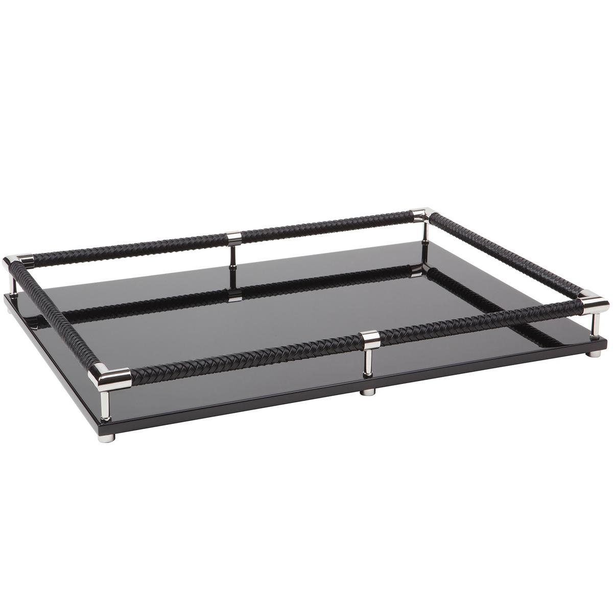 • Lackierte Tabletts mit handgeflochtener Leder-Reling, Chrom Elemente