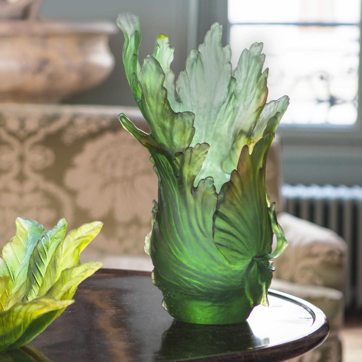 Die Abstufungen der Grüntöne wirken fast wie bei einem impressionistischen Gemälde. Der Farbverlauf ist durch den Herstellungsprozess bedingt. Die Manufaktur Daum kreiert einzigartige Objekte aus sogenannten Kristallglasteig. Jedes Produkt entsteht in reiner Handarbeit und ist damit ein Unikat. Die samtige Oberfläche ist ein weiterer Vorteil der Arbeit mit Kristallglasteig. Kleine in das Glas eingeschlossene Luftbläschen sind möglich und ein Zeichen für diesen besonderen Herstellungsprozess.