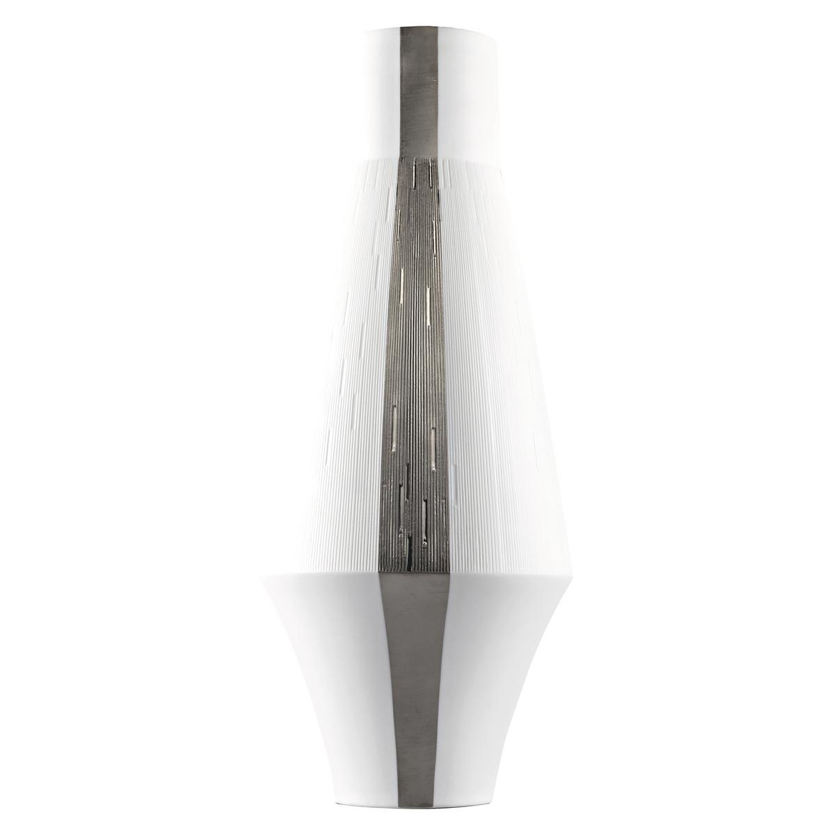 Die Vasen "Infini Platin" bestehen aus unglasiertem Limoges-Porzellan mit einer samtig-matten Platinveredelung. Die Vasen "Graphic Platin" hingegen bestehen aus glänzend glasiertem Limoges-Porzellan mit einer glänzenden Platinveredelung.