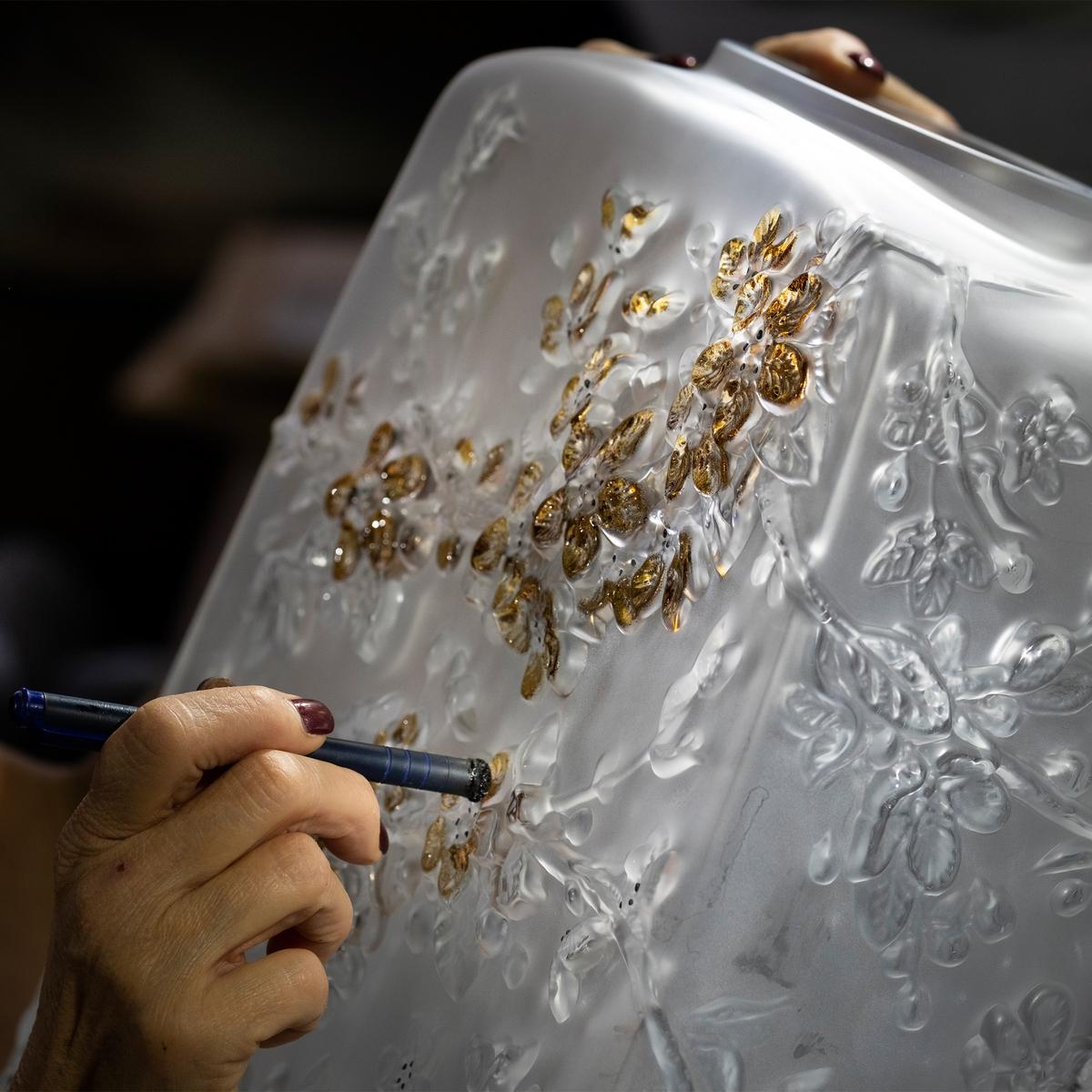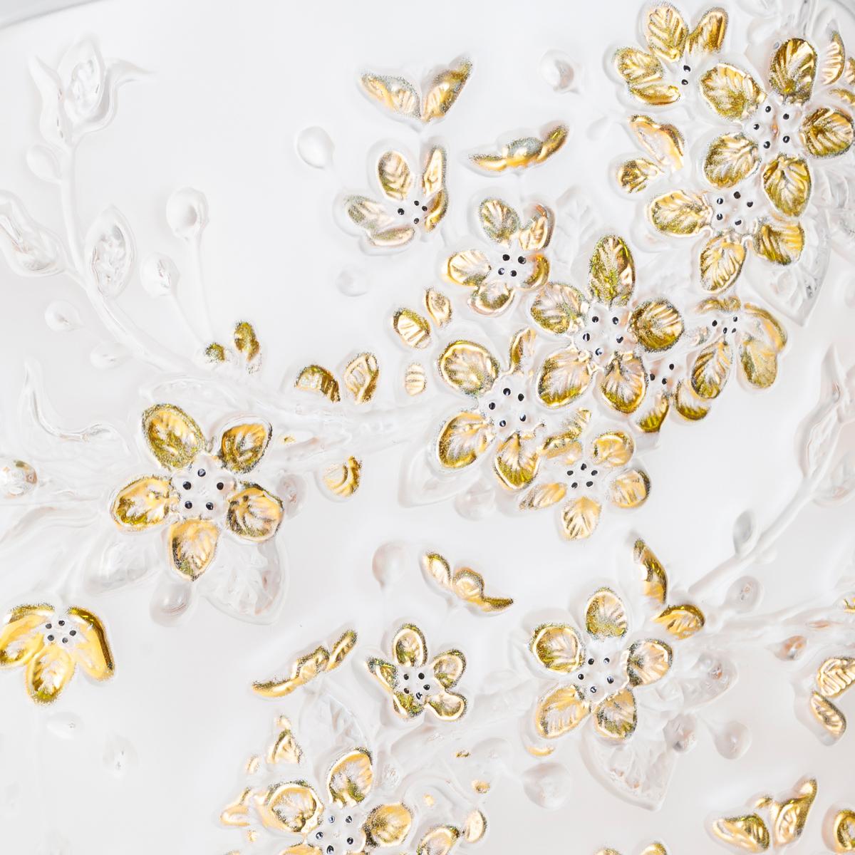 Die weltberühmte japanische Kirschblüte inspirierte die Glaskünstler von Lalique für die Vase "Fleurs de Cerisier". Die zarten, reliefartigen Kirschblüten muten täuschend echt an. Es ist eine technische Meisterleistung, die feinen Details einer Kirschblüte lebensecht und mit einer solchen Tiefenwirkung zu erschaffen. Die von Hand aufgetragene Vergoldung rundet die naturgetreue Abbildung ab und verschafft der dekorativen Vase eine einzigartige Strahlkraft.