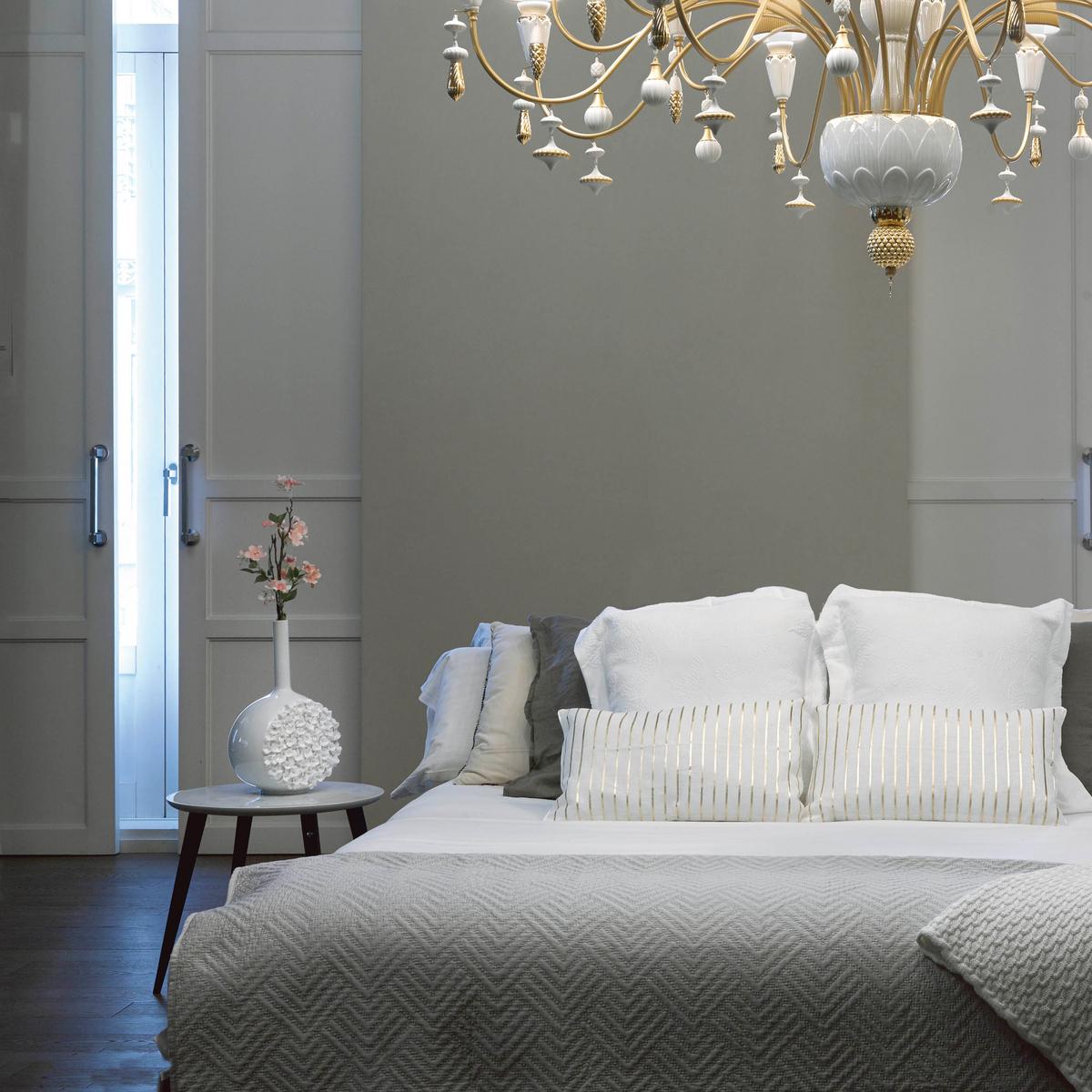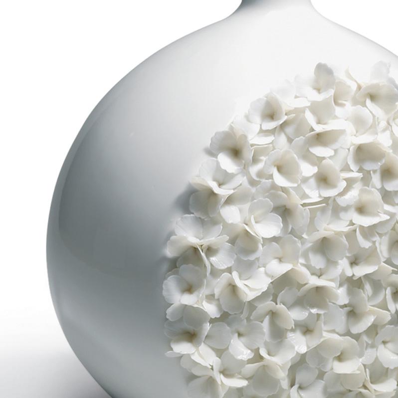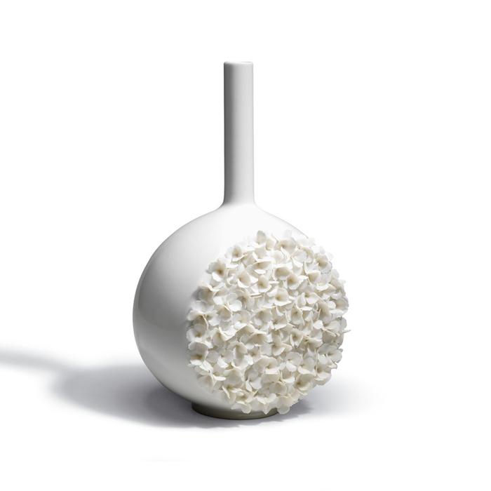 Die puristisch geformte Vase "Canvas" von Lladró zieht mit einem Bouquet aus handgefertigten Porzellanblüten die Blicke auf sich.
