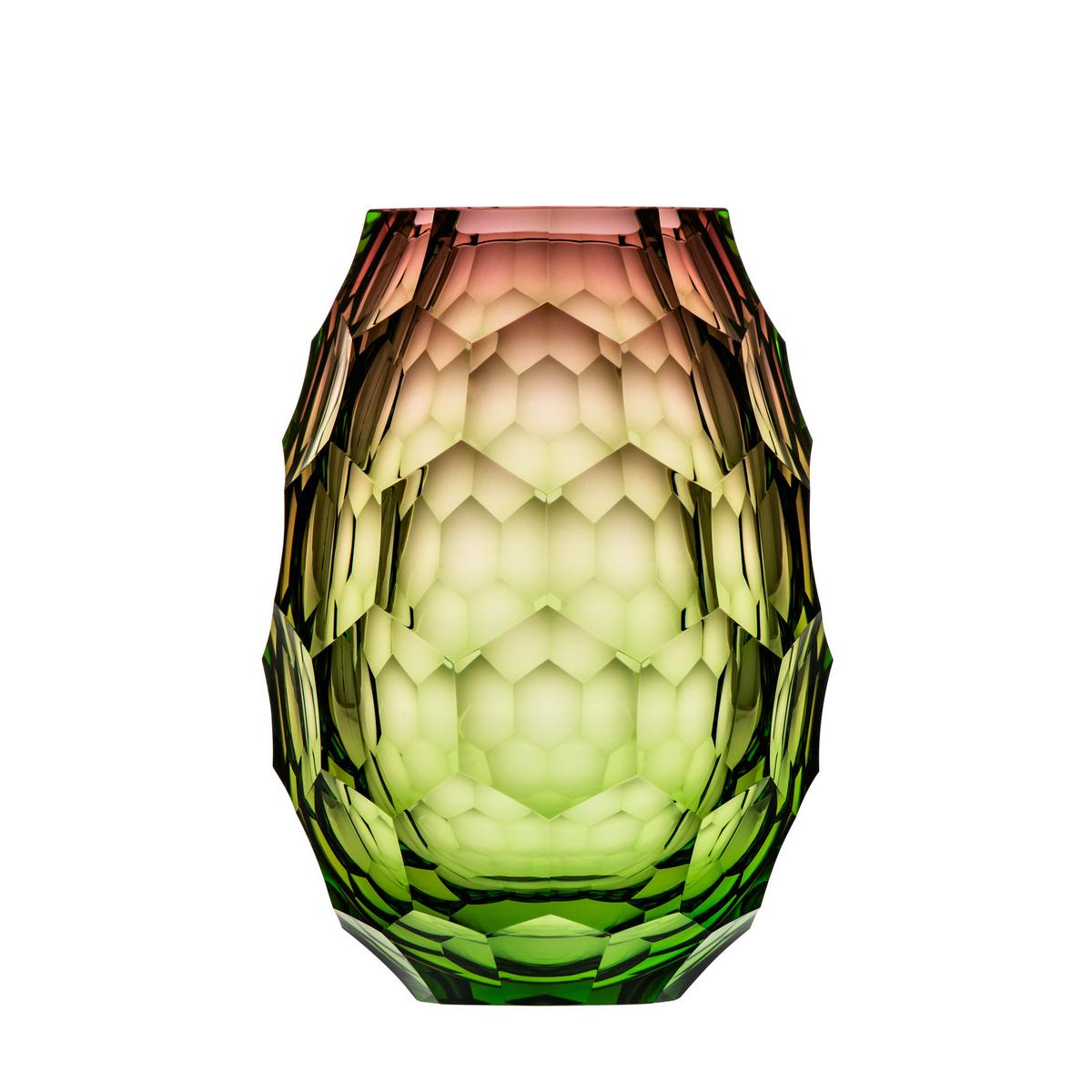 Der kantige und sechseckige Schliff sorgt für einen dreidimensionalen optischen Effekt der seines gleichen sucht. Das Zusammenspiel aus leichten Rosétönen hin zu einem Ozeangrün ist faszinierend und sehr harmonisch. Die Farben wirken beim Drehen und Wenden mal intensiv, mal hauchzart – ein besonderes Farbenspiel, welches nur Moser so einmalig beherrscht.
