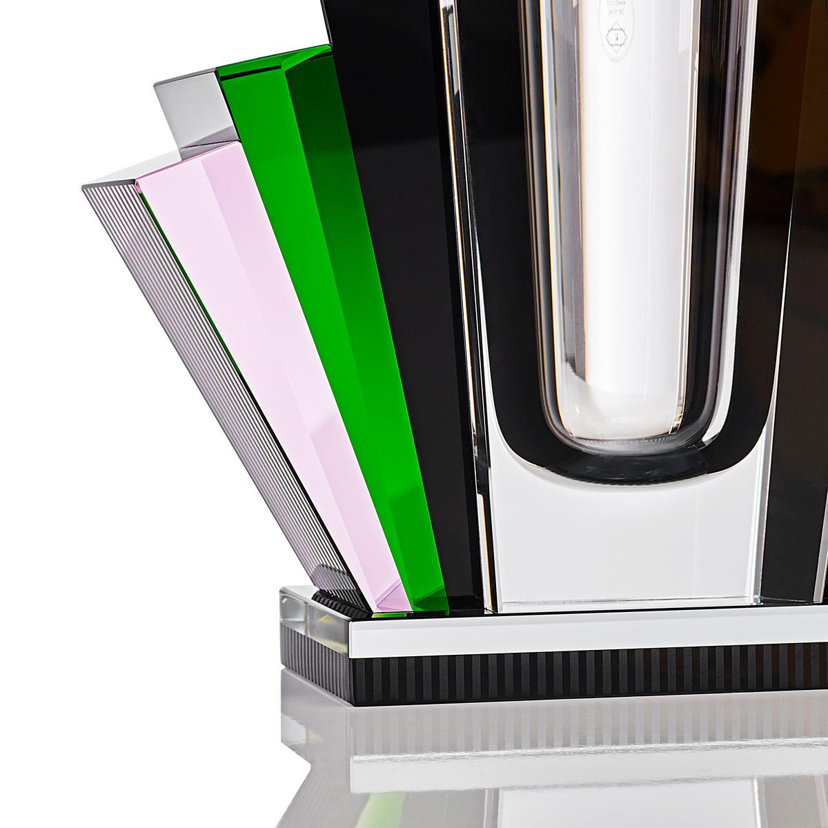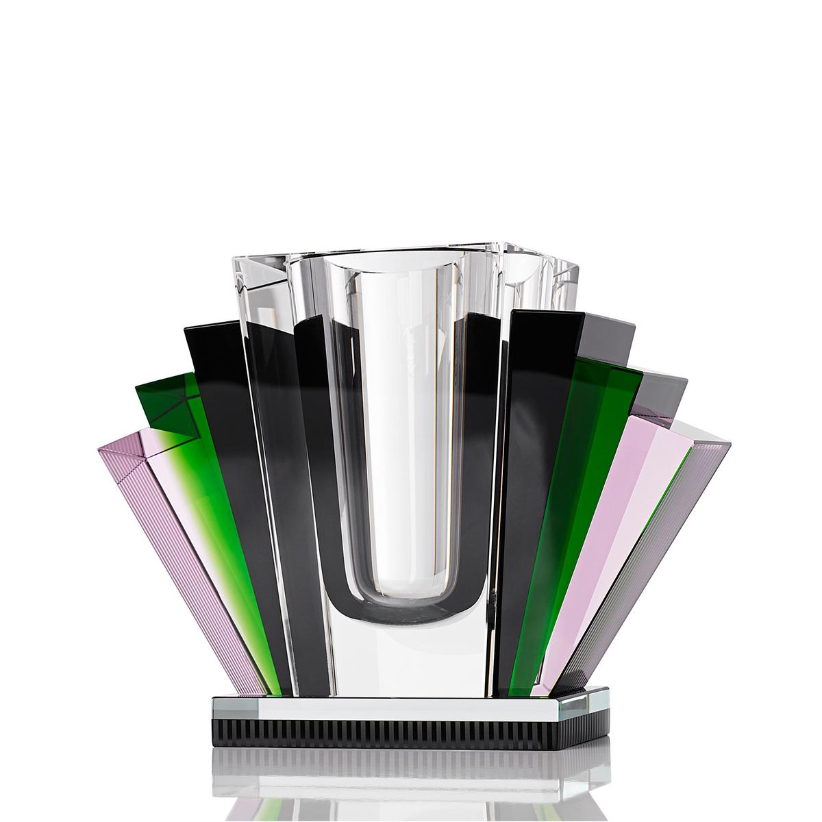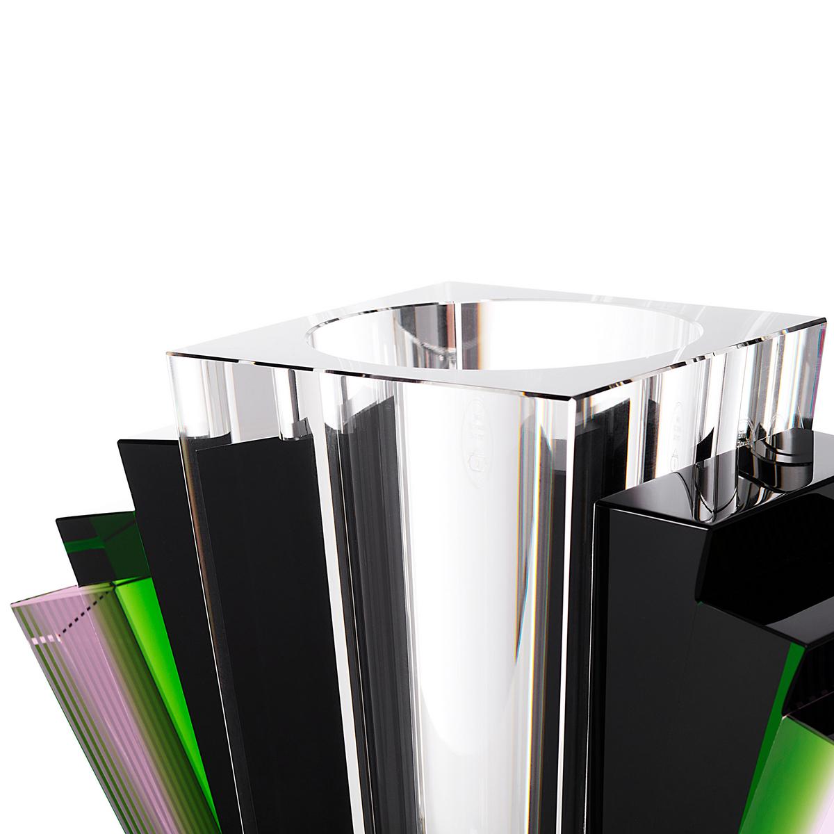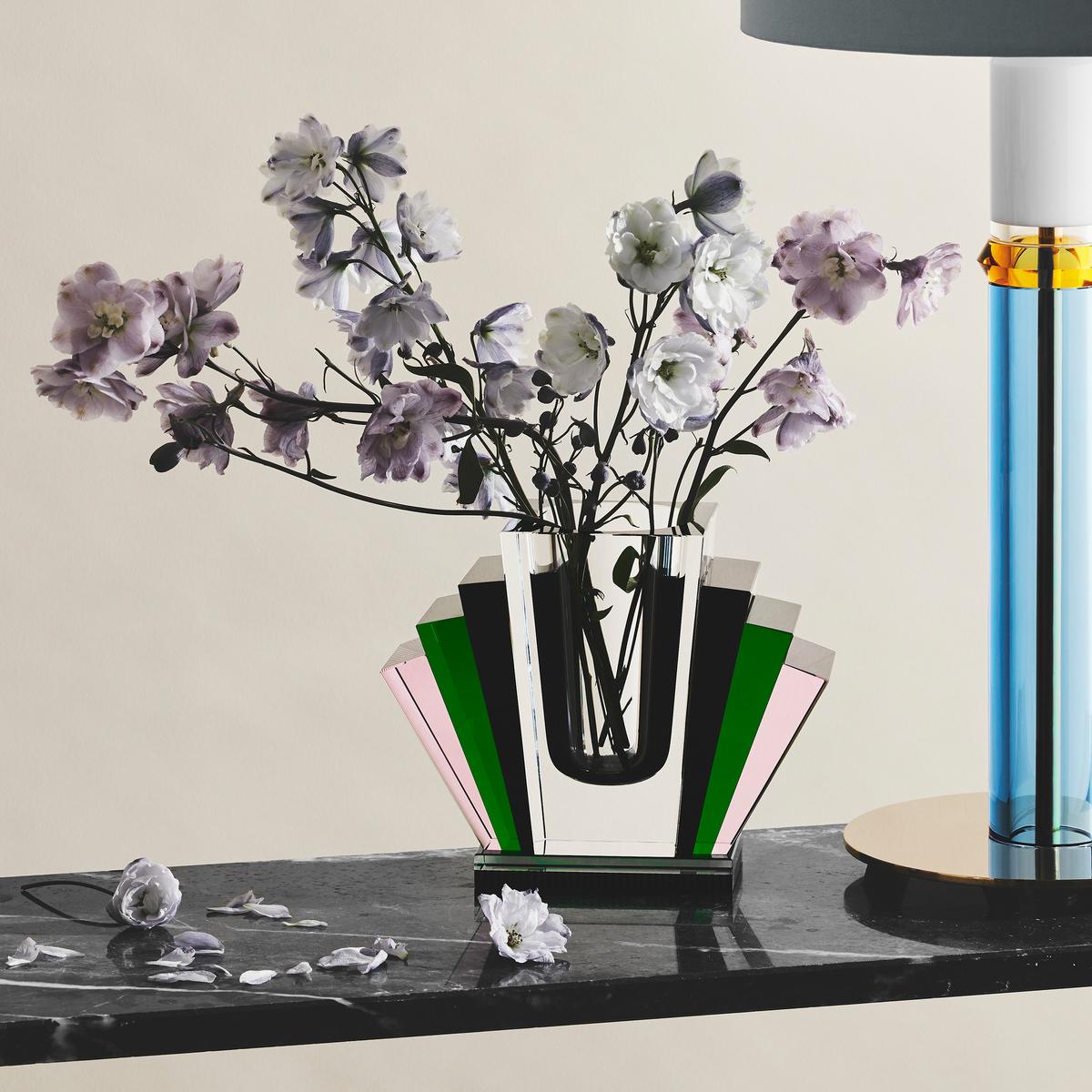 Die Vase "Harlem" von Reflections Copenhagen bringt den Glamour der frühen Wolkenkratzer New Yorks in Ihr Interieur. Die Vase ist 17,8 cm hoch und in reiner Handarbeit aus hochwertigem Kristallglas gefertigt. Die dänischen Designerinnen modernisieren das im Art Déco beliebte Fächermotiv mit einer kühnen Farbpallette aus tiefem Schwarz, intensivem Grün und zartem Pink. Die miteinander fusionierten Elemente reflektieren sich gegenseitig – von jedem Blickwinkel ergeben sich neue, aufregende Kompositionen aus Licht und Farben. Subtile Satin-Details ergänzen das Lichterspektakel. Das massive Kristallglas der Vase "Harlem" ist schwer genug, um auch große und ausladende Bouquets und Äste sicher zu halten.