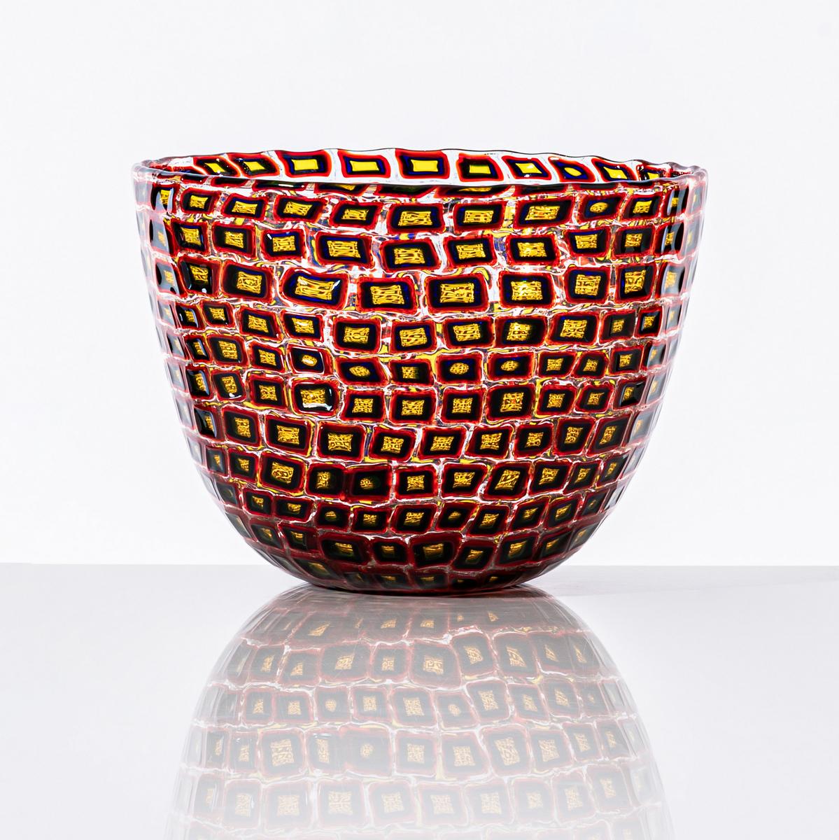 Das Verfahren, mit der die Schale und die Vase "Murrine Romane" von Venini hergestellt werden, geht auf eine sehr alte Technik zurück, die bereits bei den alten Römern verwendet wurde. Diese Technik nennt sich "Murrine" und bedeutet, dass farbige Glasstäbe miteinander verschmolzen werden. Anschließend werden die Glasstäbe in Glasbausteine zerschnitten. Diese Glasbausteine werden wiederrum zusammengesetzt und verschmolzen.