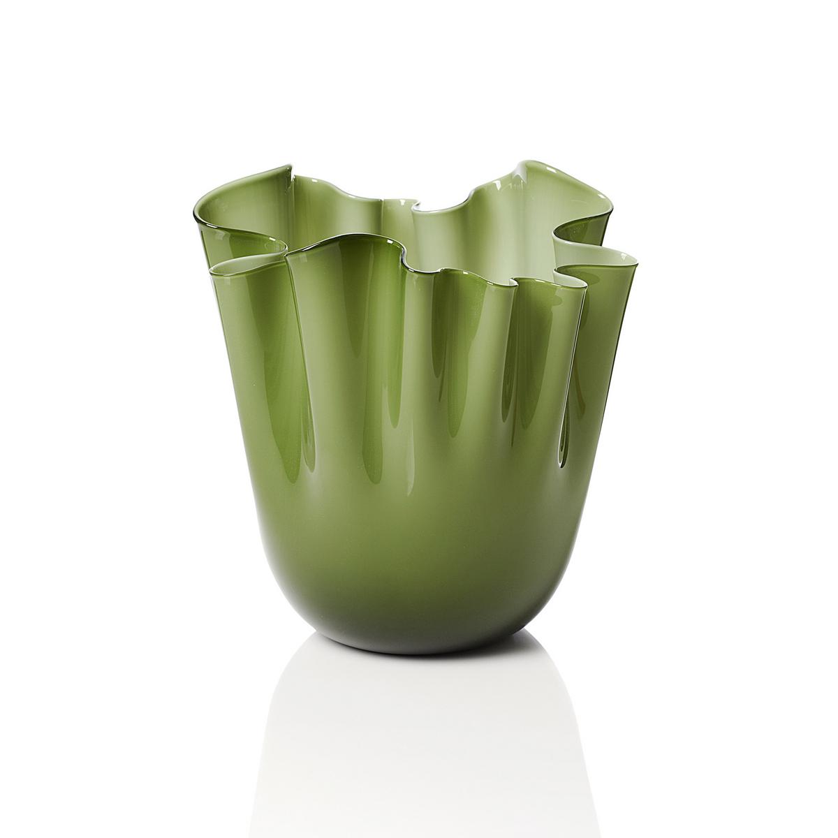 Die Fertigung einer Vase "Fazzoletti Opalino" in Apfelgrün verlangt von den Venini Glasbläsern besonders viel Kunstfertigkeit und Feingefühl. Wenn der Glasmeister eine Glaskugel geblasen hat, schneidet er diese auf. Durch geschickte Schleuderbewegungen ergibt sich die Form der Vase, welche an ein aufgestelltes Taschentuch erinnert. Daher stammt auch der Name: "Fazzoletto" bedeutet aus dem italienischen übersetzt Taschentuch. Jede Vase von Venini ist ein handgefertigtes Unikat und besitzt eine individuelle Form.
