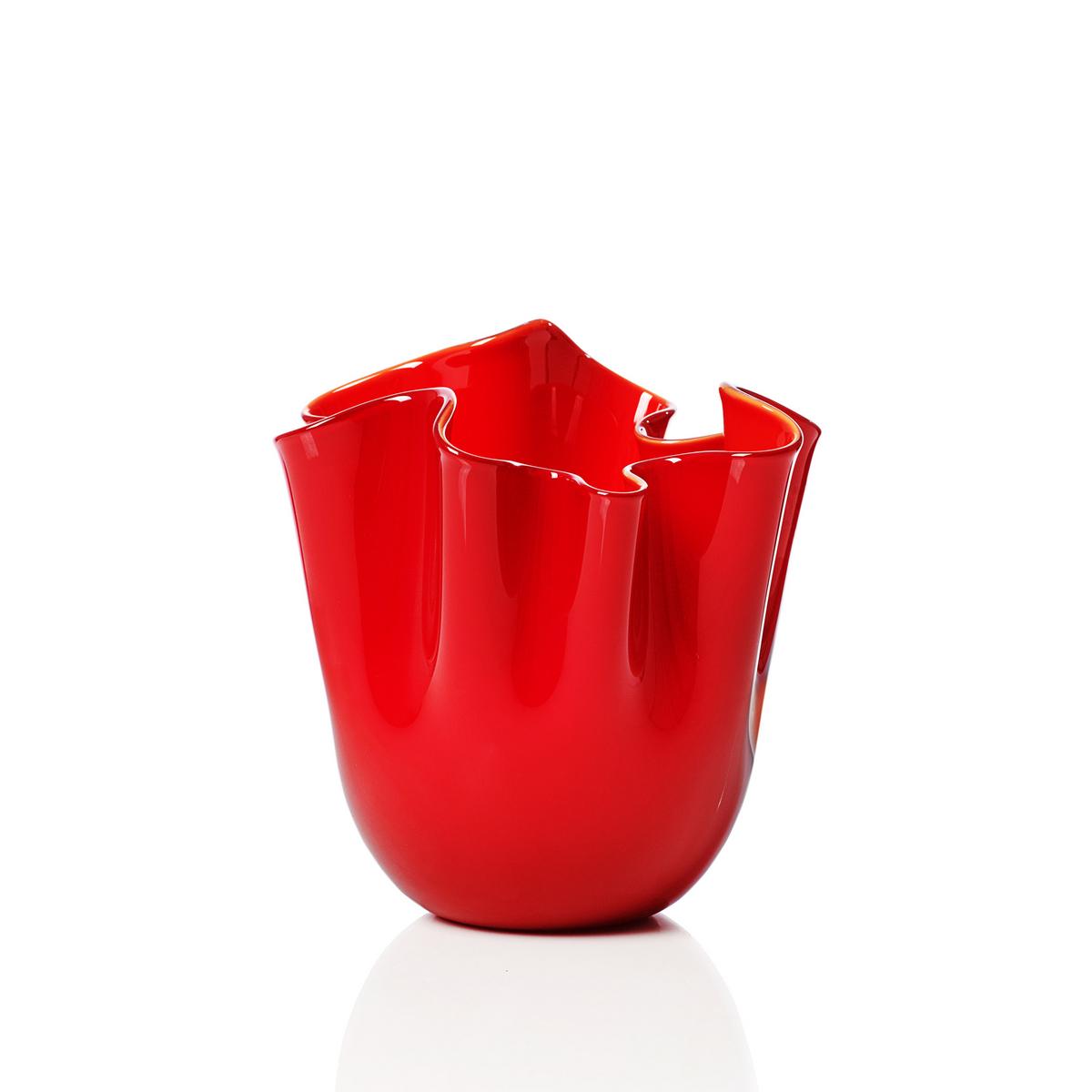 Die Fertigung einer Vase "Fazzoletti Opalino" in Rot verlangt von den Venini Glasbläsern besonders viel Kunstfertigkeit und Feingefühl. Wenn der Glasmeister eine Glaskugel geblasen hat, schneidet er diese auf. Durch geschickte Schleuderbewegungen ergibt sich die Form der Vase, welche an ein aufgestelltes Taschentuch erinnert. Daher stammt auch der Name: "Fazzoletto" bedeutet aus dem italienischen übersetzt Taschentuch. Jede Vase von Venini ist ein handgefertigtes Unikat und besitzt eine individuelle Form.