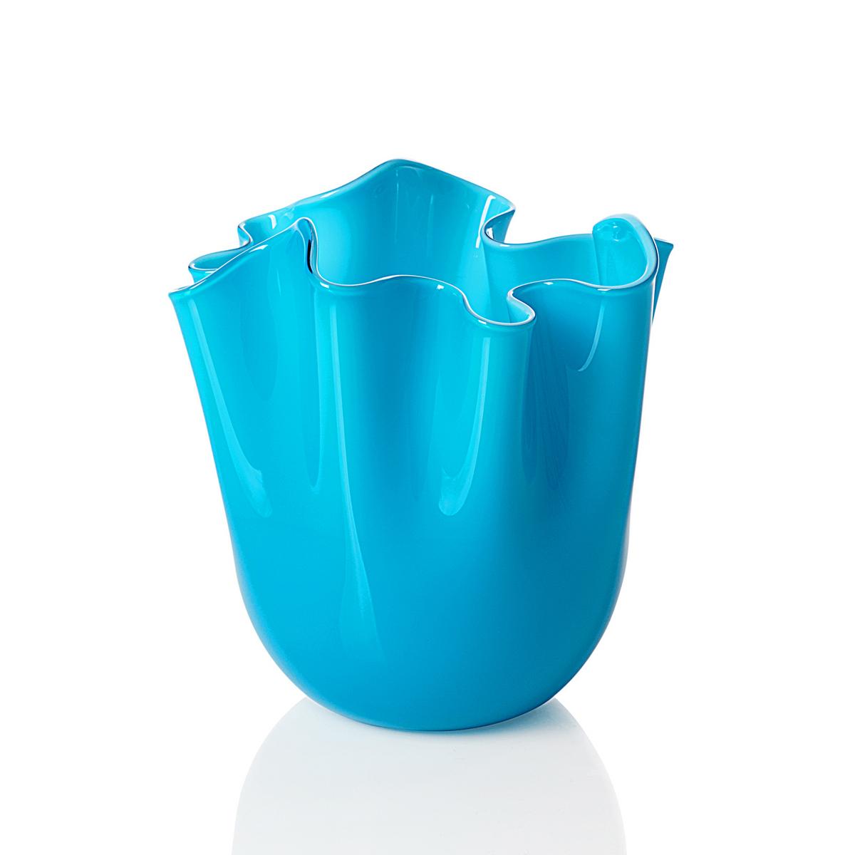 Die Fertigung einer Vase "Fazzoletti Opalino" in Hellblau verlangt von den Venini Glasbläsern besonders viel Kunstfertigkeit und Feingefühl. Wenn der Glasmeister eine Glaskugel geblasen hat, schneidet er diese auf. Durch geschickte Schleuderbewegungen ergibt sich die Form der Vase, welche an ein aufgestelltes Taschentuch erinnert. Daher stammt auch der Name: "Fazzoletto" bedeutet aus dem italienischen übersetzt Taschentuch. Jede Vase von Venini ist ein handgefertigtes Unikat und besitzt eine individuelle Form.