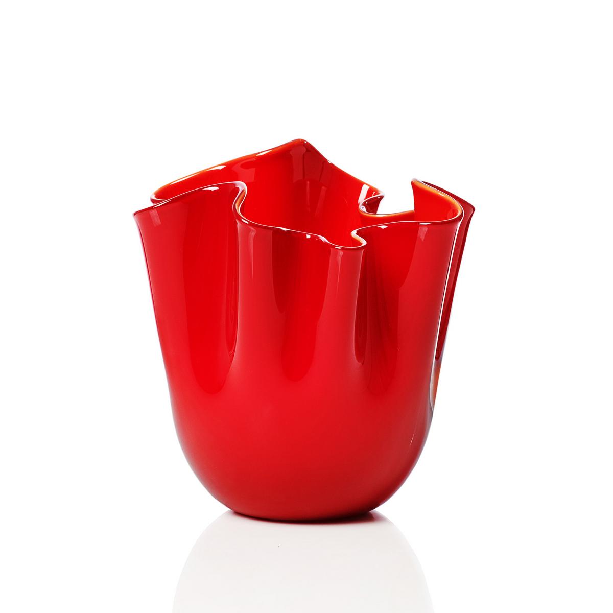 Die Fertigung einer Vase "Fazzoletti Opalino" in Rot verlangt von den Venini Glasbläsern besonders viel Kunstfertigkeit und Feingefühl. Wenn der Glasmeister eine Glaskugel geblasen hat, schneidet er diese auf. Durch geschickte Schleuderbewegungen ergibt sich die Form der Vase, welche an ein aufgestelltes Taschentuch erinnert. Daher stammt auch der Name: "Fazzoletto" bedeutet aus dem italienischen übersetzt Taschentuch. Jede Vase von Venini ist ein handgefertigtes Unikat und besitzt eine individuelle Form.