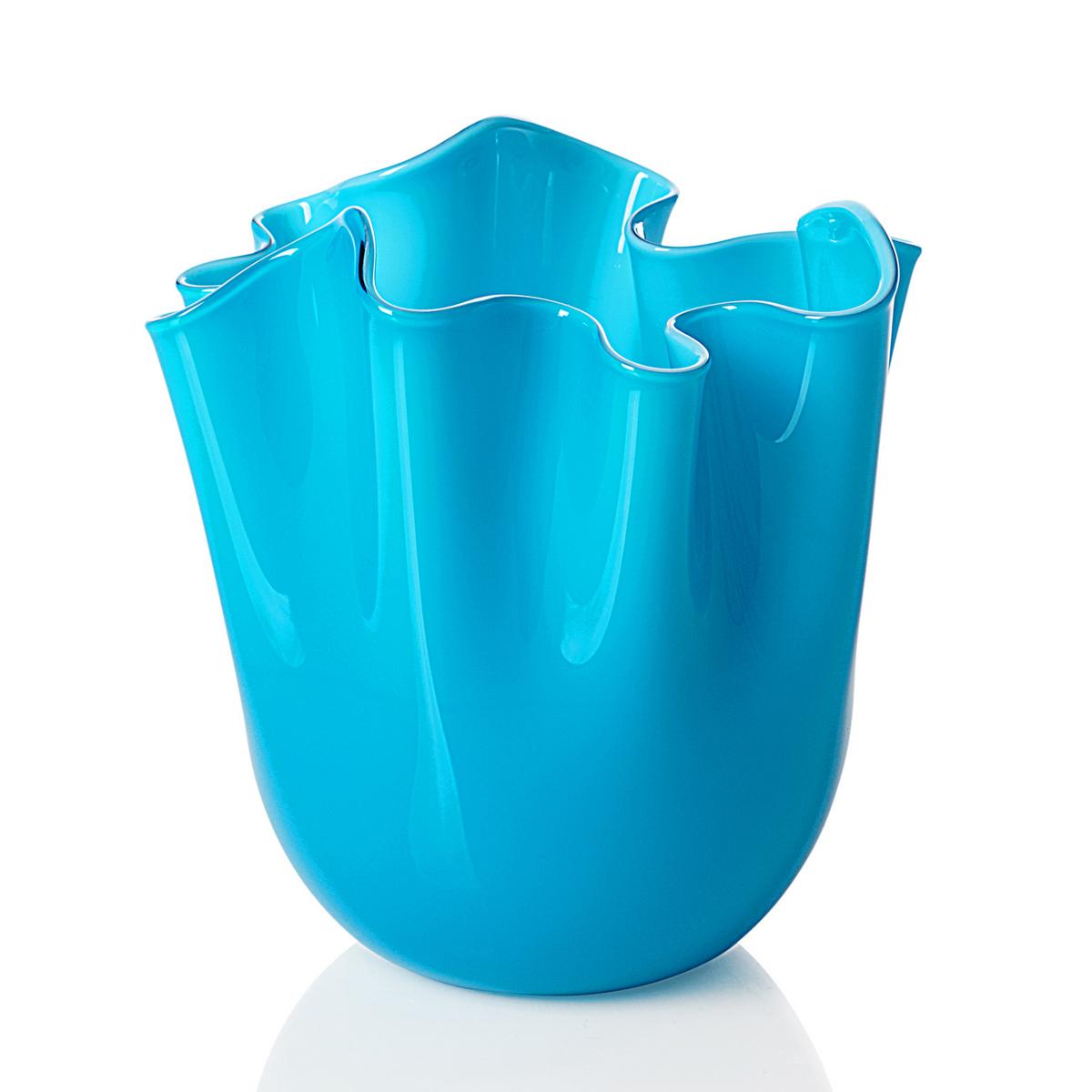 Die Fertigung einer Vase "Fazzoletti Opalino" in Hellblau verlangt von den Venini Glasbläsern besonders viel Kunstfertigkeit und Feingefühl. Wenn der Glasmeister eine Glaskugel geblasen hat, schneidet er diese auf. Durch geschickte Schleuderbewegungen ergibt sich die Form der Vase, welche an ein aufgestelltes Taschentuch erinnert. Daher stammt auch der Name: "Fazzoletto" bedeutet aus dem italienischen übersetzt Taschentuch. Jede Vase von Venini ist ein handgefertigtes Unikat und besitzt eine individuelle Form.