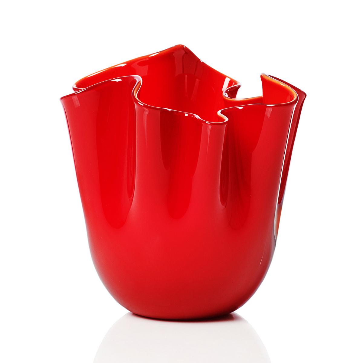 Die Fertigung einer Vase "Fazzoletti Opalino" in Rot verlangt von den Venini Glasbläsern besonders viel Kunstfertigkeit und Feingefühl. Wenn der Glasmeister eine Glaskugel geblasen hat, schneidet er diese auf. Durch geschickte Schleuderbewegungen ergibt sich die Form der Vase, welche an ein aufgestelltes Taschentuch erinnert. Daher stammt auch der Name: "Fazzoletto" bedeutet aus dem italienischen übersetzt Taschentuch. Jede Vase von Venini ist ein handgefertigtes Unikat und besitzt eine individuelle Form.