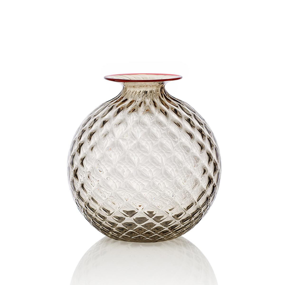 Die Vasen "Monofiori Balloton" in taupe sind ein absoluter Klassiker aus dem Hause Venini. Als Erkennungszeichen für die bauchigen Muranoglas-Vasen dient die rote Linie am Vasenhals. Der farbige Glasring entsteht durch die sogenannte "Balloton" Technik. Dafür wird ein heißer Ring aus Glas auf den Glaskörper der Venini Vase "Monofiori Balloton" aufgetragen. Dieser bildet einen hübschen Kontrast zum kugelrunden Körper der Muranoglas Vase.