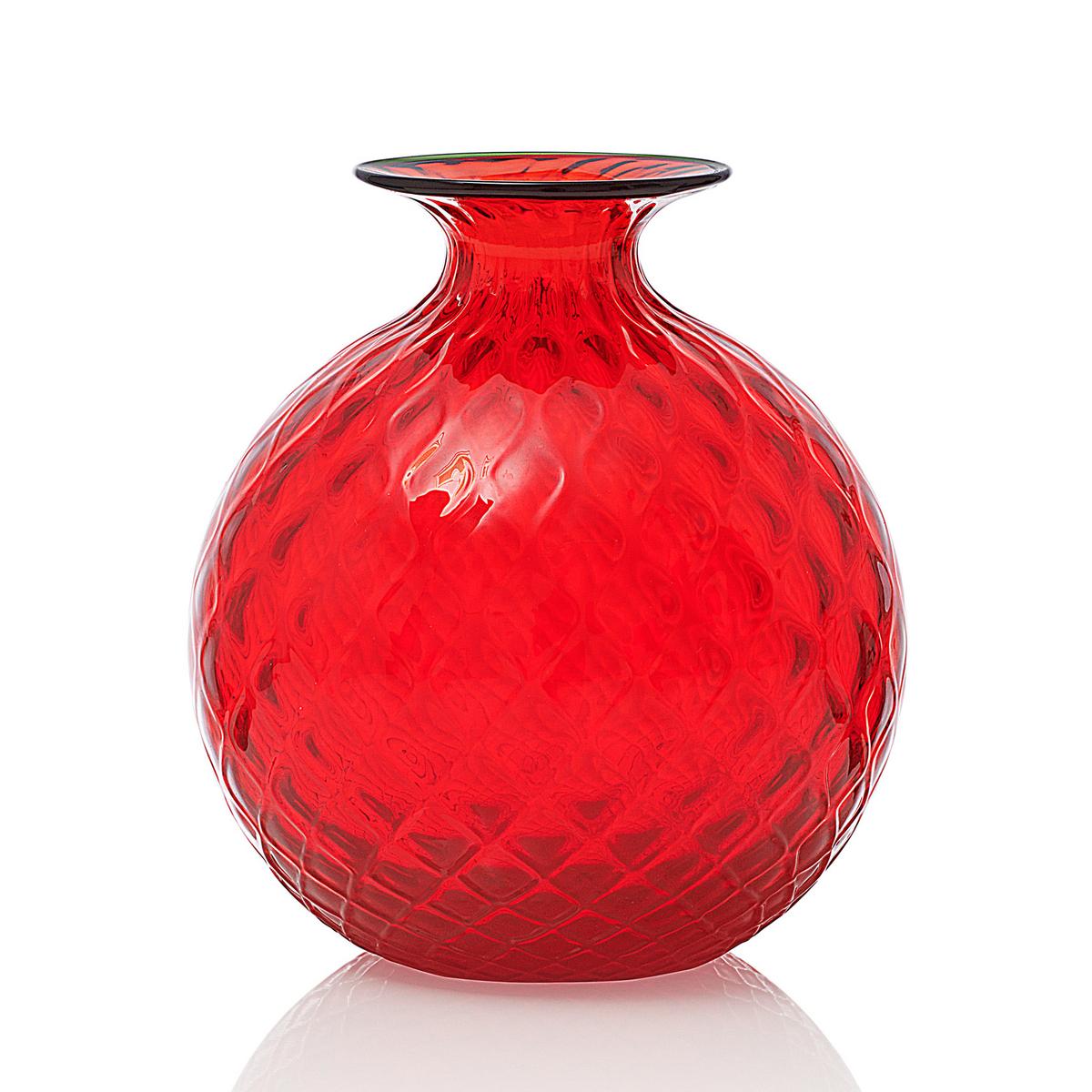 Die Vasen "Monofiori Balloton" in rot sind ein absoluter Klassiker aus dem Hause Venini. Als Erkennungszeichen für die bauchigen Muranoglas-Vasen dient die rote Linie am Vasenhals. Der farbige Glasring entsteht durch die sogenannte "Balloton" Technik. Dafür wird ein heißer Ring aus Glas auf den Glaskörper der Venini Vase "Monofiori Balloton" aufgetragen. Dieser bildet einen hübschen Kontrast zum kugelrunden Körper der Muranoglas Vase.