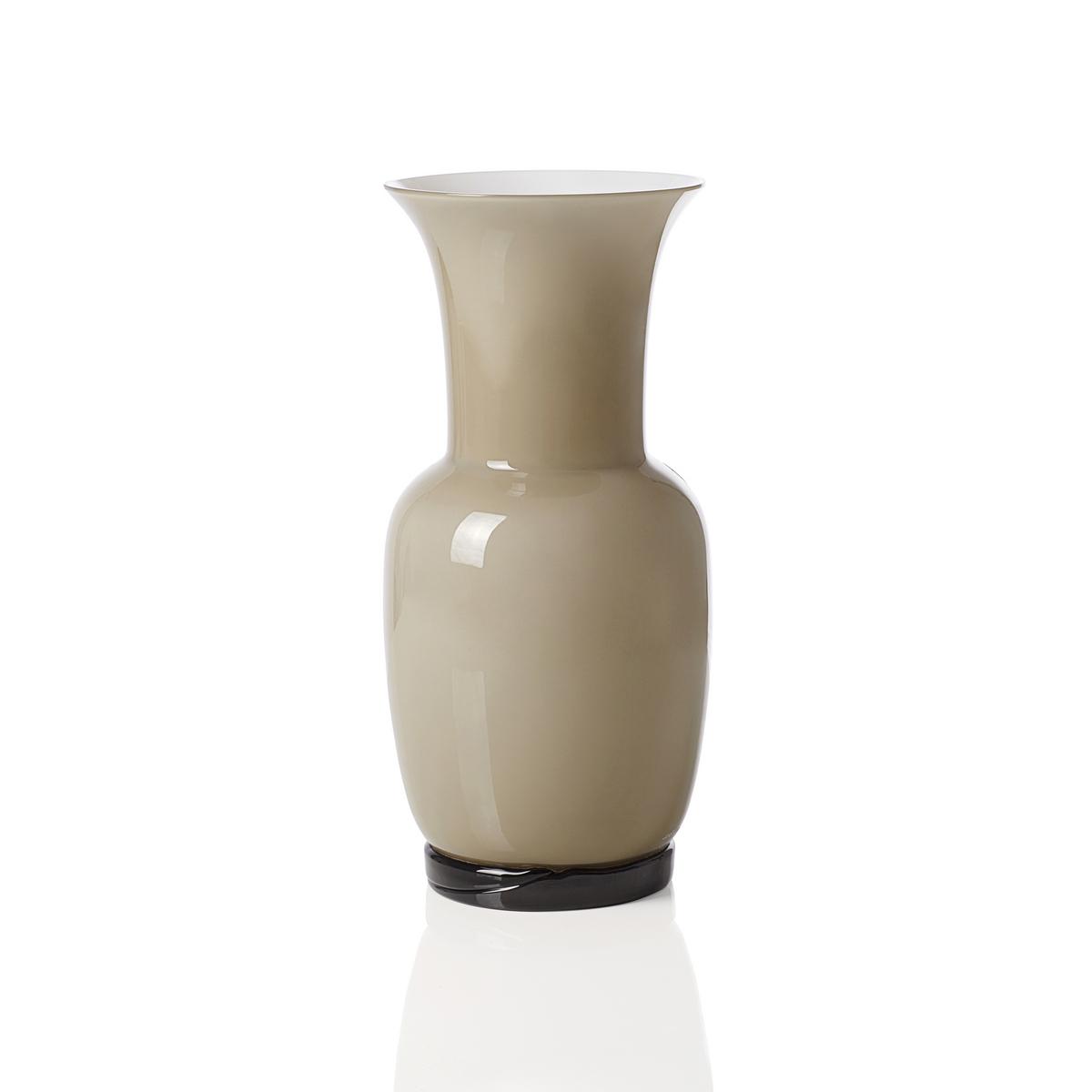 Die Vasen "Opalino" in Taupe gehören zu den absoluten Klassikern aus dem Hause Venini. Die Vasen aus Muranoglas entstehen in der sogenannten "Überfangtechnik". Die Überfangtechnik gehört zu den ältesten Glasbearbeitungstechniken. Es bedarf besondere Fertigkeiten der Glasbläser mit dieser Technik wunderschöne Glaskunst herzustellen. Die Einzigartigkeit von Venini sind die außergewöhnlichen Glasfarben der Vasen "Opalino", welche je nach Tageslicht immer wieder anders leuchten.