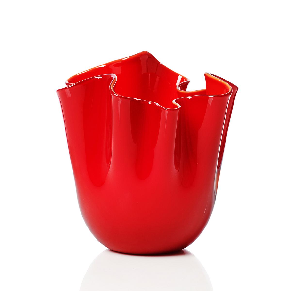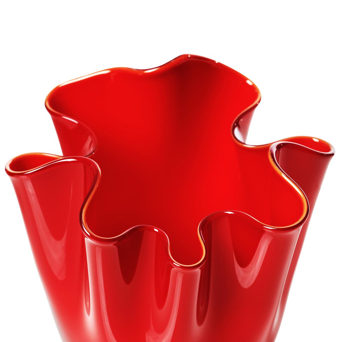 Die Fertigung einer Vase "Fazzoletti Opalino" in Rot verlangt von den Venini Glasbläsern besonders viel Kunstfertigkeit und Feingefühl. Wenn der Glasmeister eine Glaskugel geblasen hat, schneidet er diese auf. Durch geschickte Schleuderbewegungen ergibt sich die Form der Vase, welche an ein aufgestelltes Taschentuch erinnert. Daher stammt auch der Name: "Fazzoletto" bedeutet aus dem italienischen übersetzt Taschentuch. Jede Vase von Venini ist ein handgefertigtes Unikat und besitzt eine individuelle Form.
