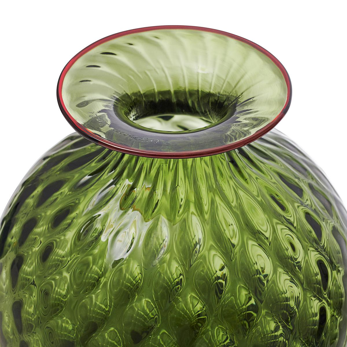 Die Vasen "Monofiori Balloton" in apfelgrün sind ein absoluter Klassiker aus dem Hause Venini. Als Erkennungszeichen für die bauchigen Muranoglas-Vasen dient die rote Linie am Vasenhals. Der farbige Glasring entsteht durch die sogenannte "Balloton" Technik. Dafür wird ein heißer Ring aus Glas auf den Glaskörper der Venini Vase "Monofiori Balloton" aufgetragen. Dieser bildet einen hübschen Kontrast zum kugelrunden Körper der Muranoglas Vase.
