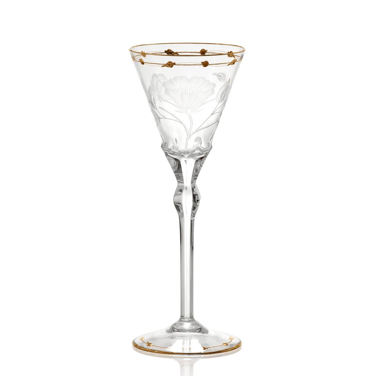 Um jedes Glas der Linie "Paula" von Moser legt sich ein filigranes Band aus goldenen Blättern, auch ihre Ränder sind golden eingefasst. So wirken die Gläser "Paula" opulent und doch verspielt: Typisch für das Design des Art Nouveau, die Stilepoche, in der das Design von "Paula" entstanden ist.