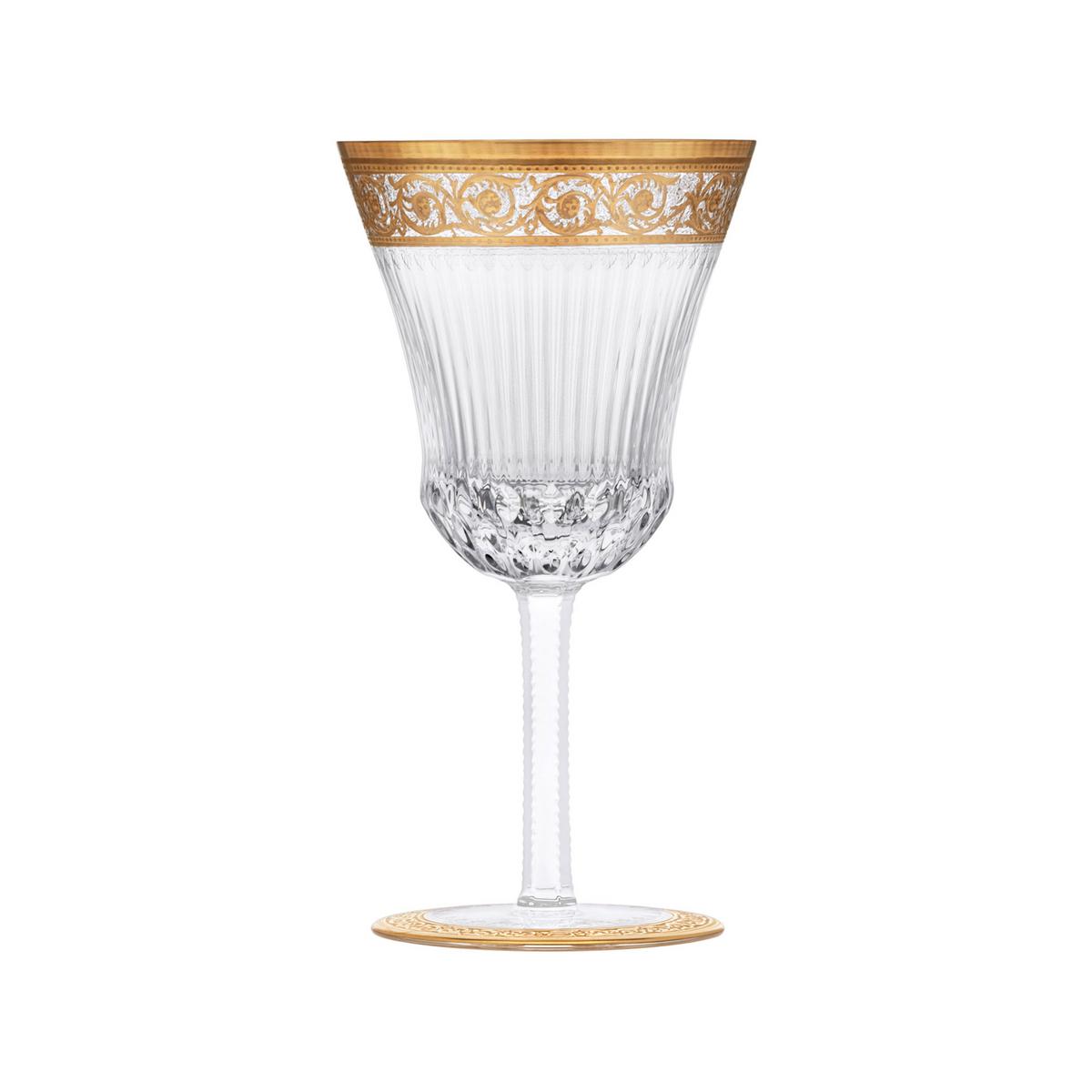 An Luxus unübertroffen: Die Glasserie "Thistle Gold" stammt aus dem Jahr 1913 und ist eine der großen Klassiker und wertvollsten Serien der Cristallerie Saint-Louis. Dank ihrer prunkvollen Ausstrahlung schmückt sie auch offiziell die Tafel vieler Staatsoberhäupter. Jedes Glas ist mundgeblasen und handgeschliffen. Das elegante Dekor aus feinstem Gold wird mit dem Pinsel aufgetragen, anschließend gebrannt und mit Achatstein poliert. Die Distel mit ihren sonnenförmigen Blütenköpfen und stacheligen Ranken ist Vorlage für die Goldornamente und den kunstvollen Schliff der Glasserie "Thistle Gold".