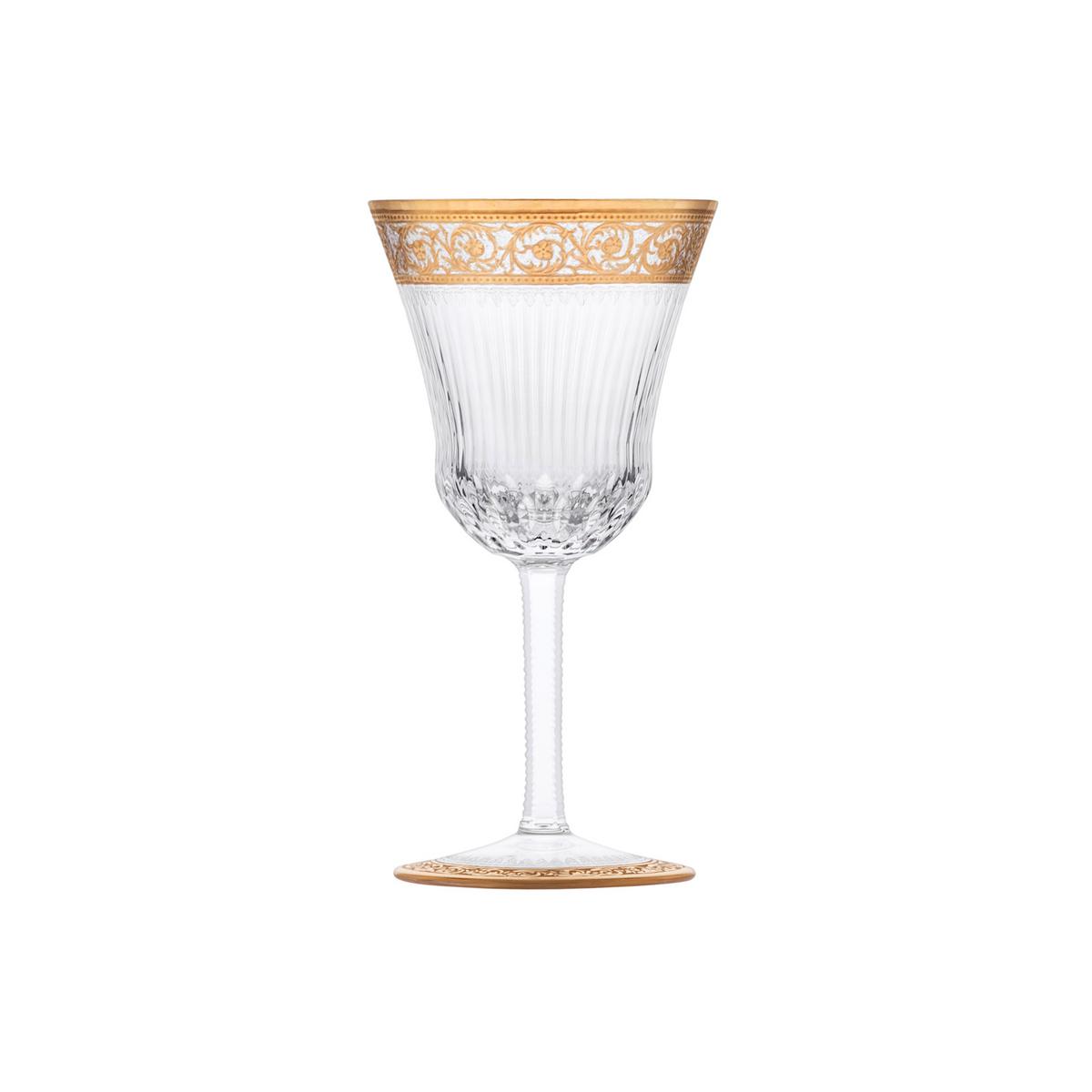 An Luxus unübertroffen: Die Glasserie "Thistle Gold" stammt aus dem Jahr 1913 und ist eine der großen Klassiker und wertvollsten Serien der Cristallerie Saint-Louis. Dank ihrer prunkvollen Ausstrahlung schmückt sie auch offiziell die Tafel vieler Staatsoberhäupter. Jedes Glas ist mundgeblasen und handgeschliffen. Das elegante Dekor aus feinstem Gold wird mit dem Pinsel aufgetragen, anschließend gebrannt und mit Achatstein poliert. Die Distel mit ihren sonnenförmigen Blütenköpfen und stacheligen Ranken ist Vorlage für die Goldornamente und den kunstvollen Schliff der Glasserie "Thistle Gold".