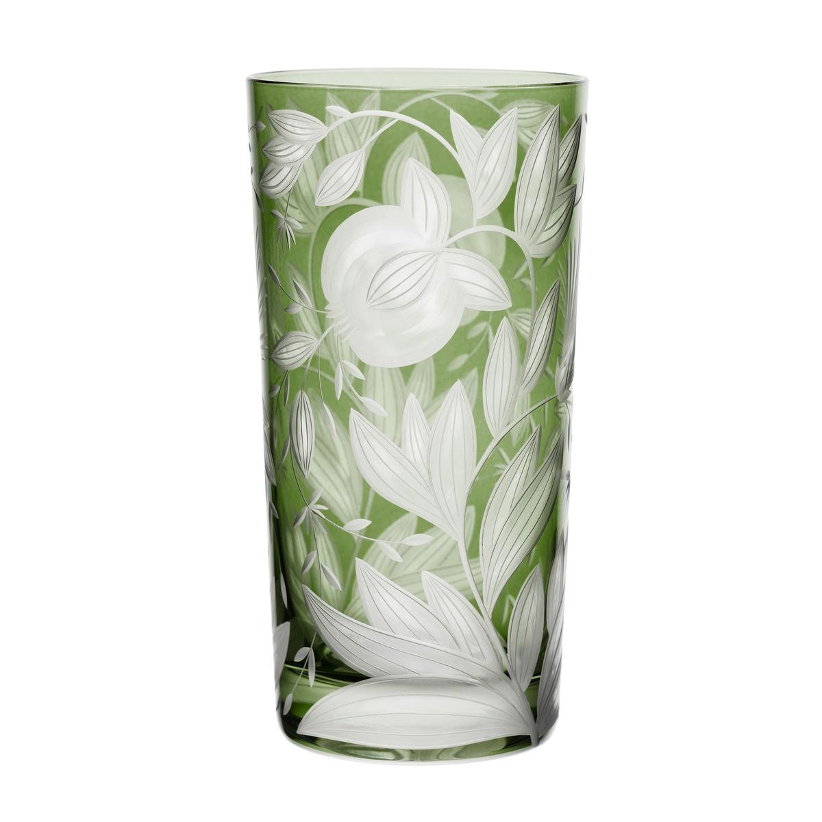 "Kunstvolle Tafelschätze: Handgefertigte Objekte aus feinstem Porzellan und Kristallglas veredeln die Tischkultur. Von böhmischen Jugendstil inspiriert: Mundgeblasenes, handgraviertes Highballglas Verdure von Artel."