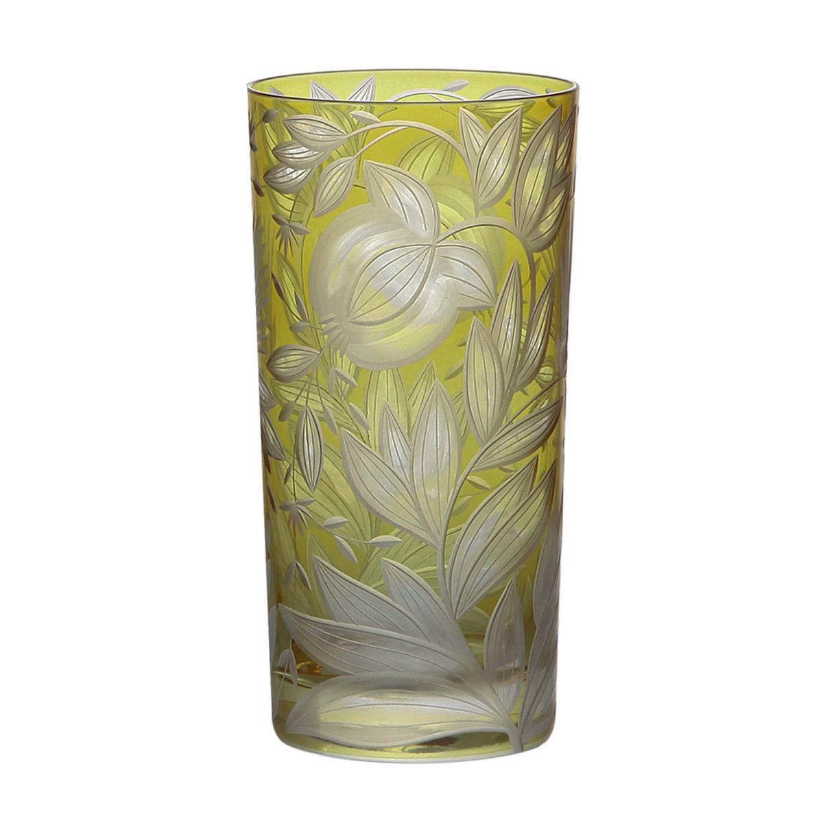"Kunstvolle Tafelschätze: Handgefertigte Objekte aus feinstem Porzellan und Kristallglas veredeln die Tischkultur. Von böhmischen Jugendstil inspiriert: Mundgeblasenes, handgraviertes Highballglas Verdure von Artel."