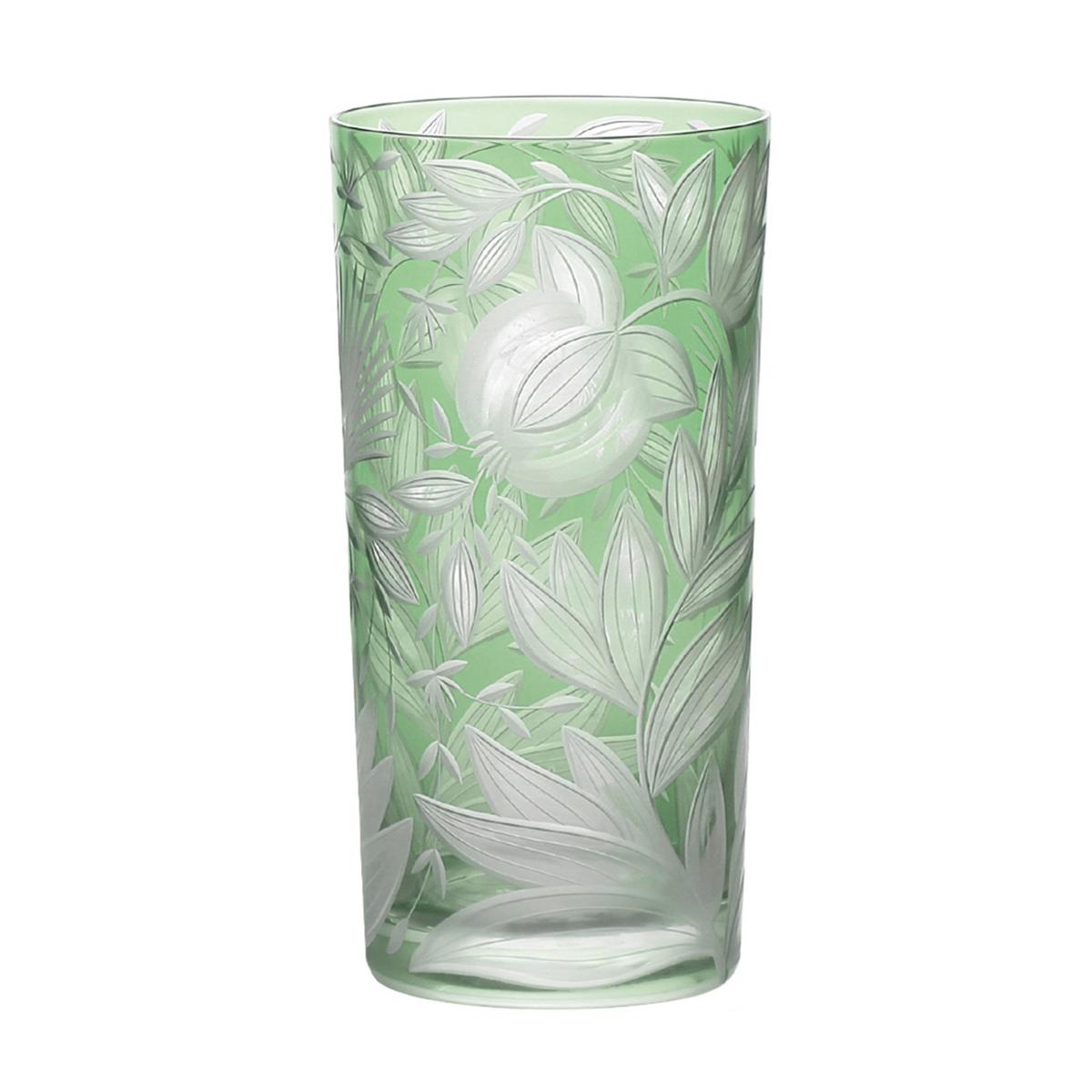 "Kunstvolle Tafelschätze: Handgefertigte Objekte aus feinstem Porzellan und Kristallglas veredeln die Tischkultur. Von böhmischen Jugendstil inspiriert: Mundgeblasenes, handgraviertes Highballglas Verdure von Artel."