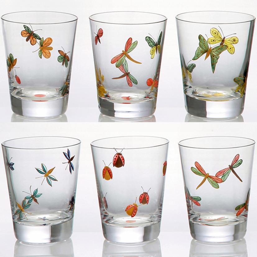 Über die Wände der mundgeblasenen Becher "Bug Painted" von Artel schweben Käfer, Libellen, Schmetterlinge und besondere Flügeltiere, wie um duftende Blumen oder Lampen in einer Sommernacht.