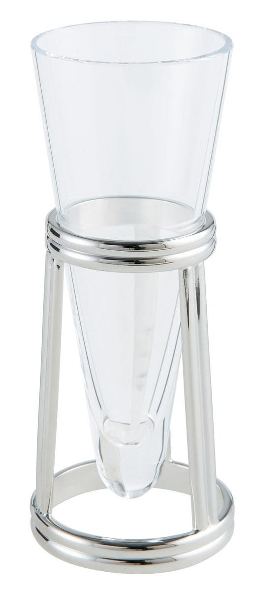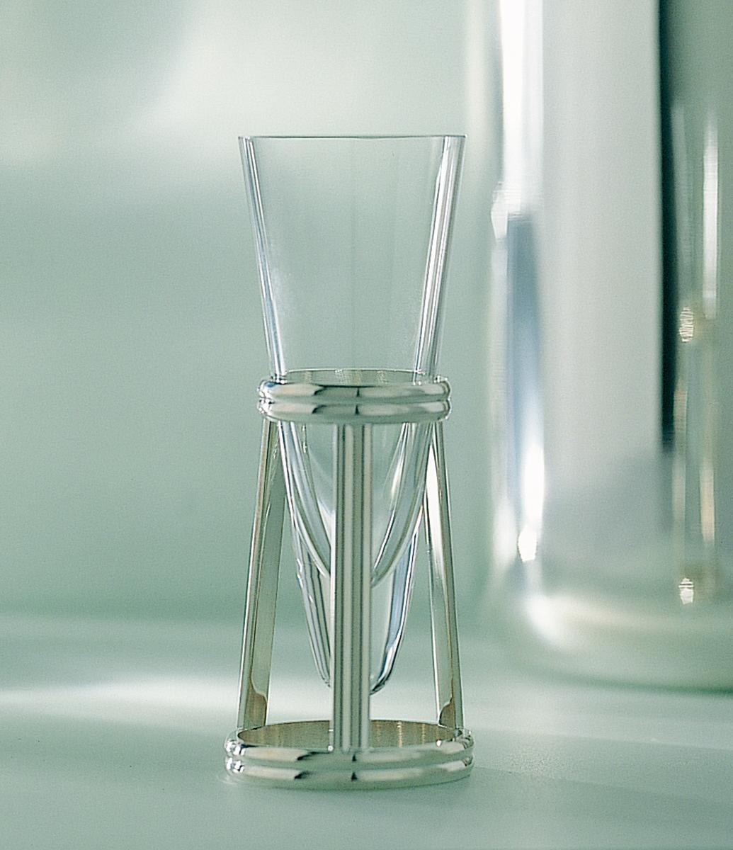 Es präsentiert kleine Sorbets oder Desserts ebenso gewandt wie delikate Appetizer oder Suppen im Kleinstformat. Bis zu 50 Milliliter kann das kegelförmige Glas aus der Pariser Silberschmiede Ercuis dabei aufnehmen. Seine Vielseitigkeit macht das Wodkaglas "Nura" im versilberten Stativ dabei zu einem beliebten Helfer für Bar und Tafel. Trink- und Standfestigkeit garantiert.