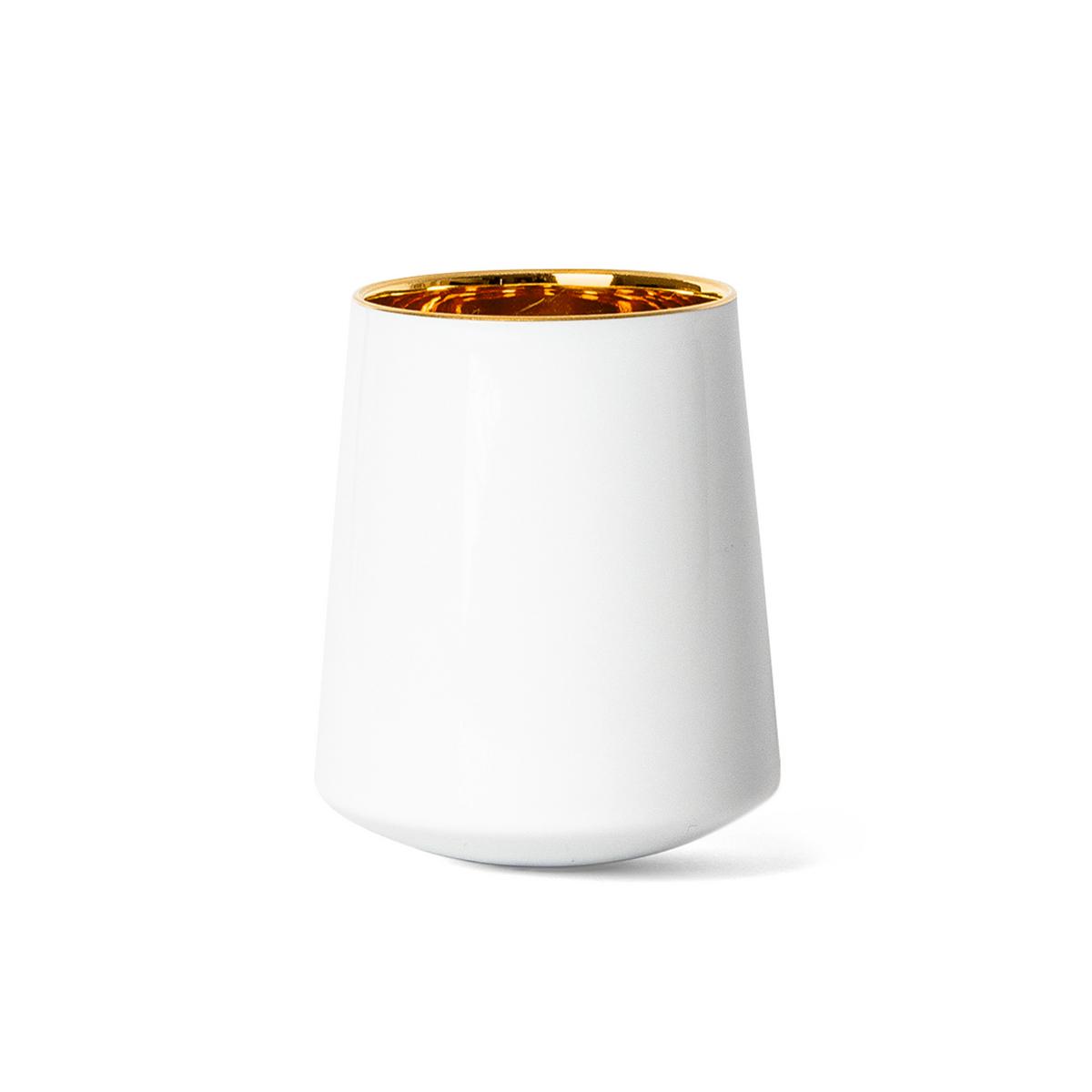 Das puristische Weiß steht im Kontrast zu dem opulenten, warm leuchtenden 24-Karat-Gold im Inneren. Die vorhandene Doppelwand der Becher hält Wein, prickelnden Champagner oder erfrischendes Mineralwasser länger kühl. Auch für den besonderen Kaffeegenuss eignen sich die Becher aufgrund ihrer Doppelwand.