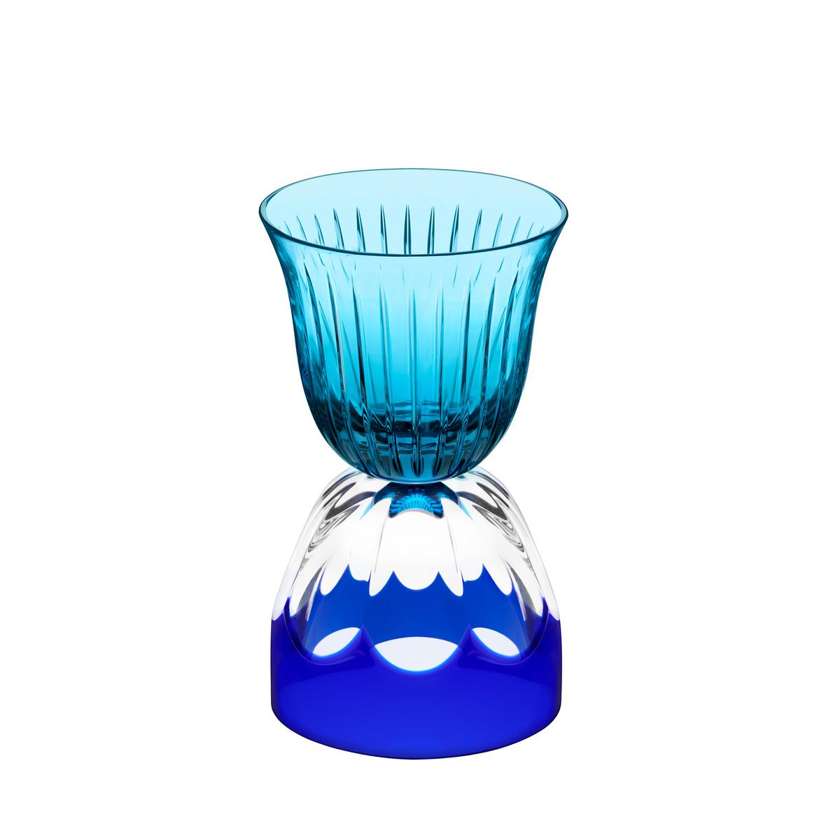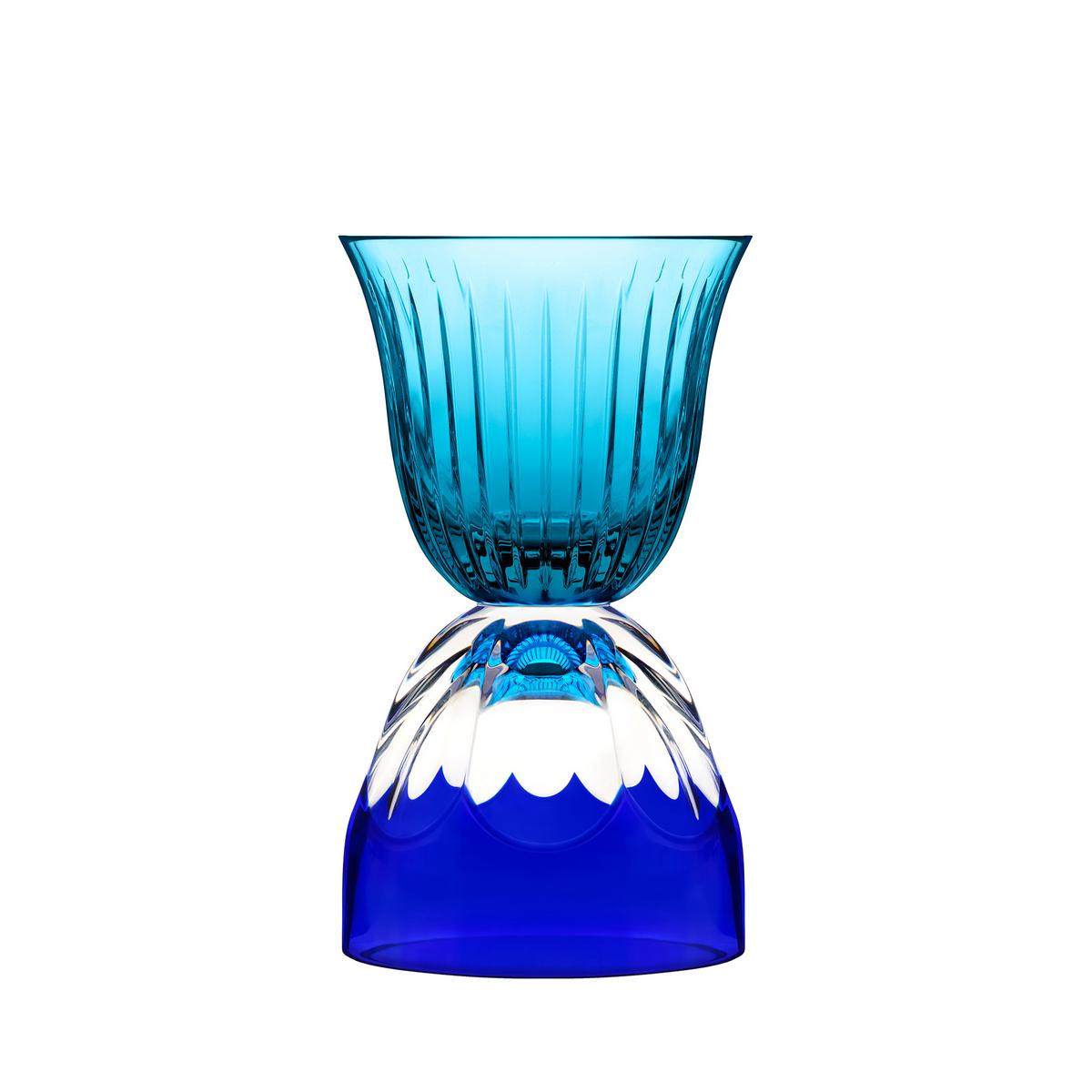 "Elegante Gefäßerweiterung. Für seine Kollektion "Les Endiablés" hat José Levy die Gläser der renommierten Crystal Saint Louis Serie entstielt und auf den Kopf gestellt. Mundgeblasenes, handgeschliffenes Kristallglas."