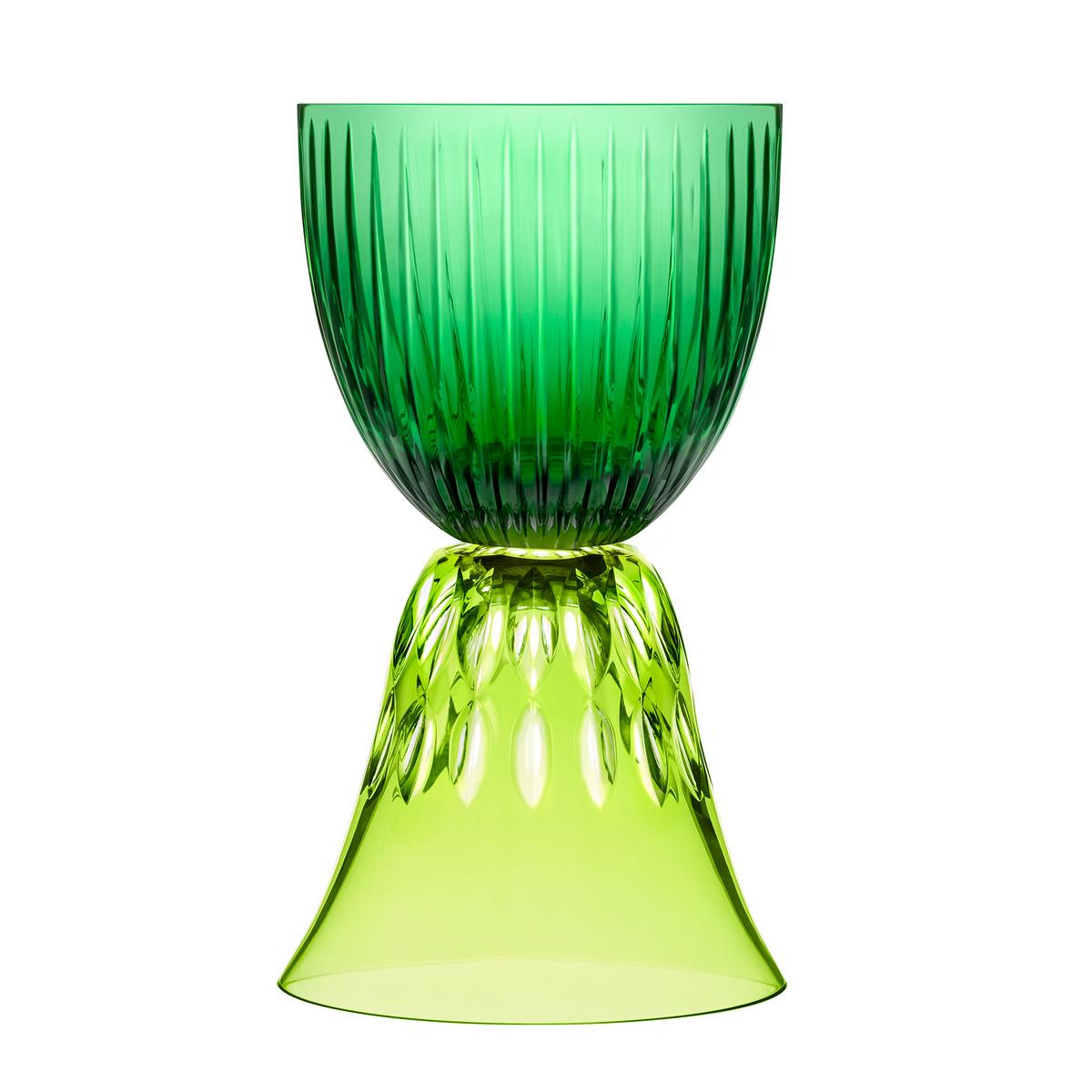"Elegante Gefäßerweiterung. Für seine Kollektion "Les Endiablés" hat José Levy die Gläser der renommierten Crystal Saint Louis Serie entstielt und auf den Kopf gestellt. Mundgeblasenes, handgeschliffenes Kristallglas."