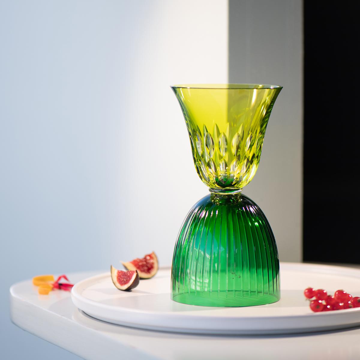 "Die französische Cristallerie Saint-Louis ist berühmt für Ihre Entwürfe. Die mundgeblasenen Gläser aus der Serie Les Endiablés können auch auf den Kopf gestellt, also beidseitig verwendet werden."