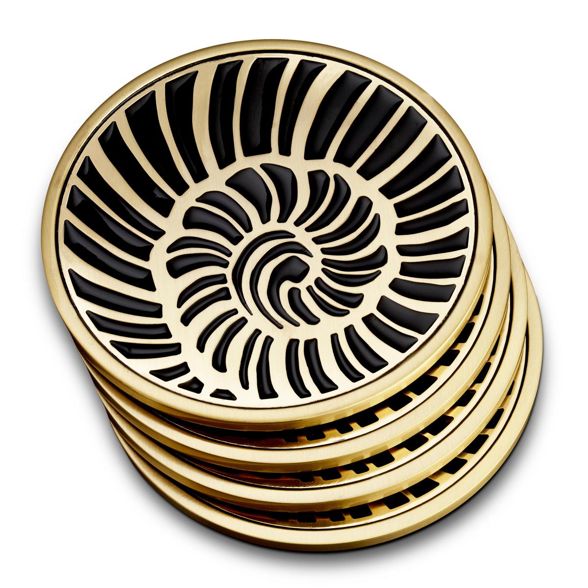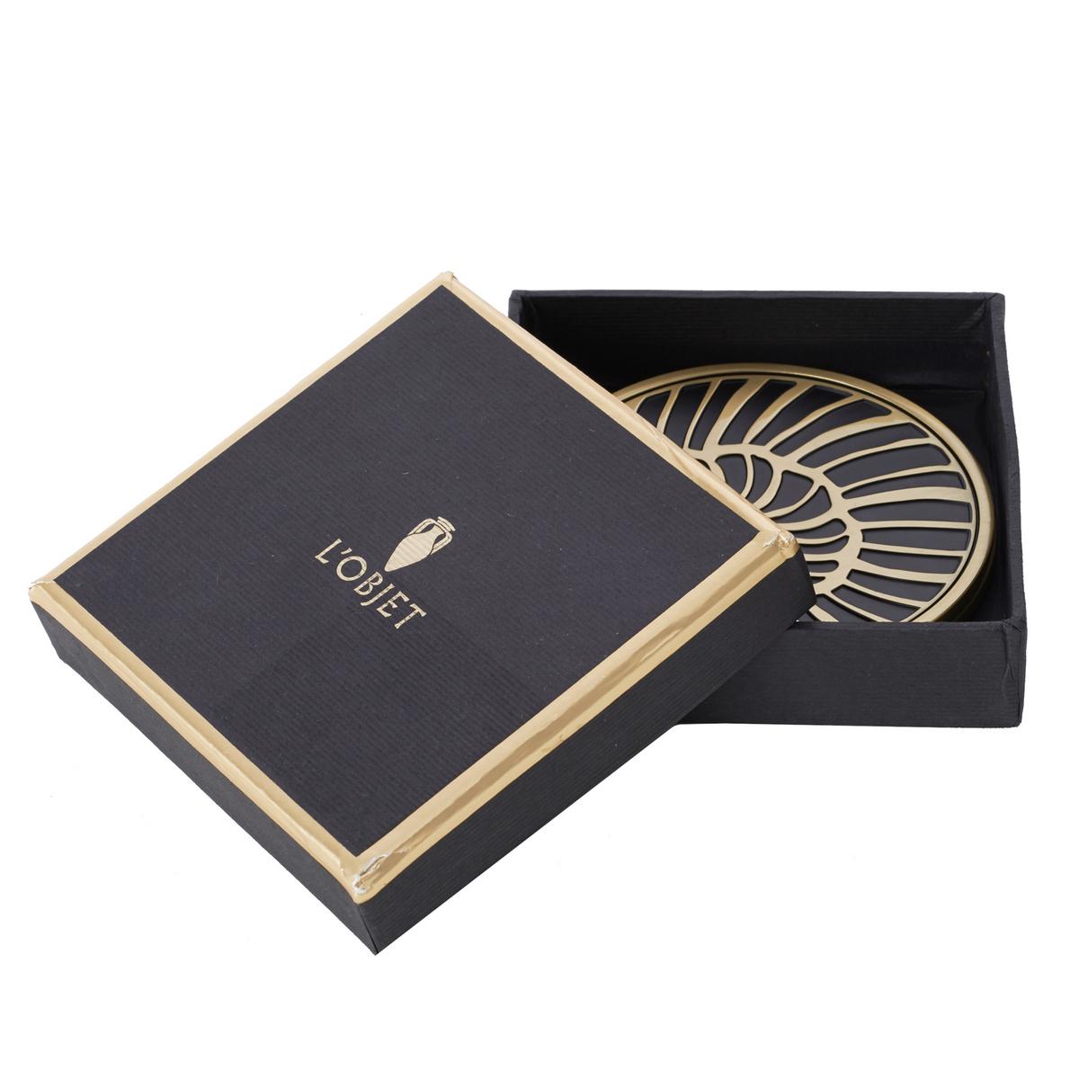 Die Glasuntersetzer "Shell" von L'Objet sind vergoldet (24-Karat) und aus schwarzem Emaille mit kleinen Filzschonern auf der Unterseite. Die schwarz-goldene Farbkombination der Glasuntersetzer "Shell" von L'Objet passt gut zu hochwertigen Gläsern, das reliefartige Muster erinnert an Muscheln.