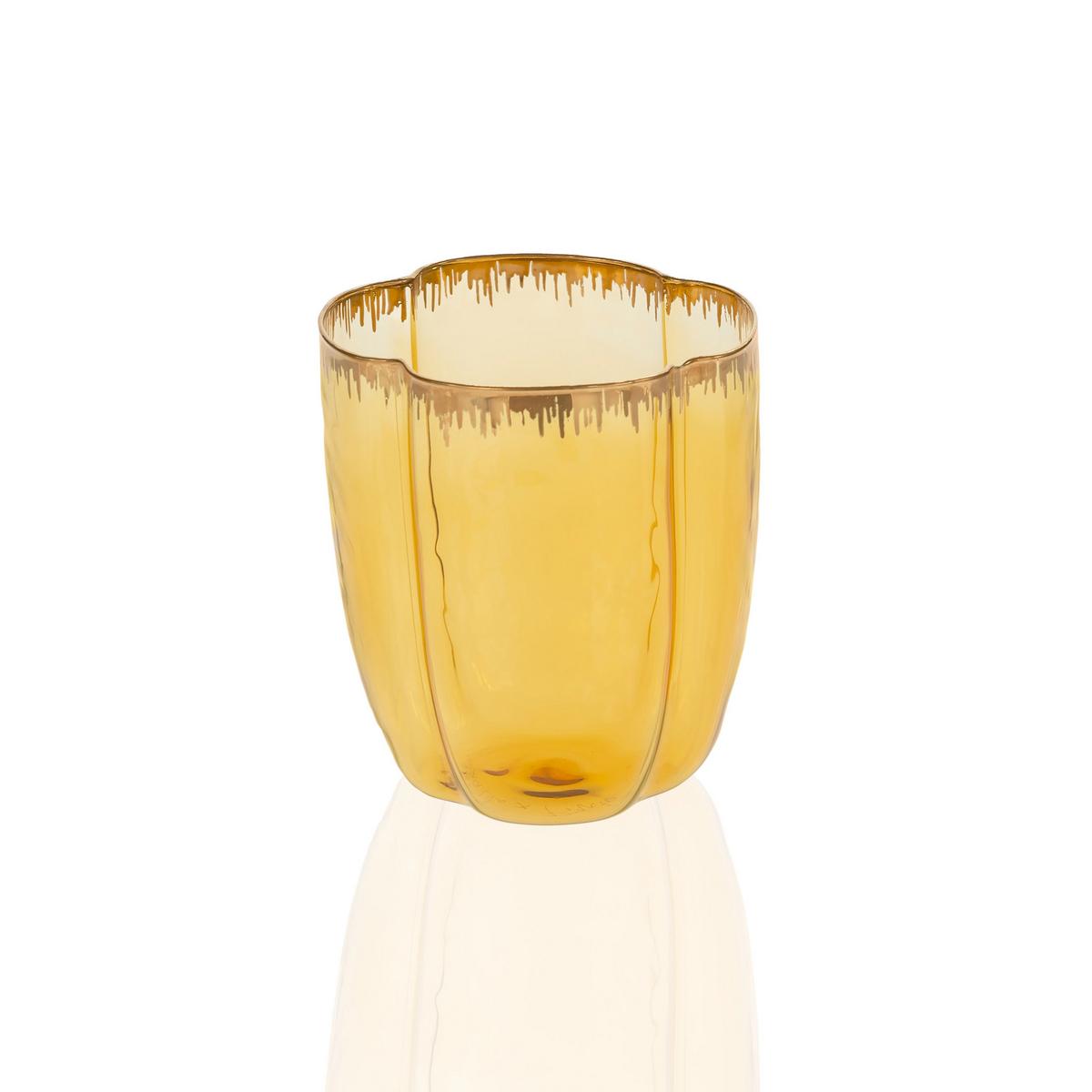 Gläserne Talismane für die gedeckte Tafel. Die Silhouetten der Gläser "Chance" von Alberto Pinto orientieren sich an der Form eines vierblättrigen Kleeblatts. Die Ränder der Trinkgläser sind zusätzlich mit einem handgemalten Goldrand dekoriert, der an die hellen Zeichnungen der Kleeblätter erinnert. Die Kollektion enthält einen Becher in Blau, Pink, Grün und Gelb sowie je ein Rotweinglas und ein Wasserglas in Klar.