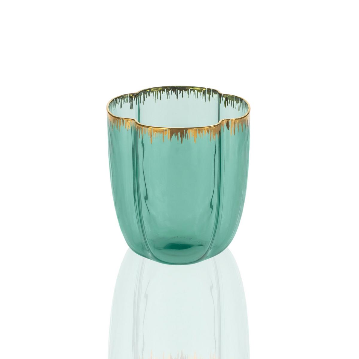 Gläserne Talismane für die gedeckte Tafel. Die Silhouetten der Gläser "Chance" von Alberto Pinto orientieren sich an der Form eines vierblättrigen Kleeblatts. Die Ränder der Trinkgläser sind zusätzlich mit einem handgemalten Goldrand dekoriert, der an die hellen Zeichnungen der Kleeblätter erinnert. Die Kollektion enthält einen Becher in Blau, Pink, Grün und Gelb sowie je ein Rotweinglas und ein Wasserglas in Klar.