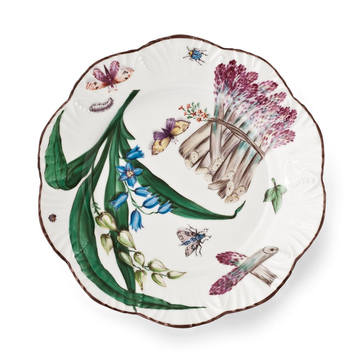 "Feuillage" von Alberto Pinto entführt Sie in die zauberhafte Welt botanischer Kunst. Inspiriert von historischen englischen Porzellanservices des 18. Jahrhunderts, vereint dieses edle Geschirr kunstvolle Darstellungen von Blättern, Blüten, Beeren, Früchten, Gemüse und Insekten – meisterhaft von Hand auf feinstem Limoges-Porzellan gemalt.