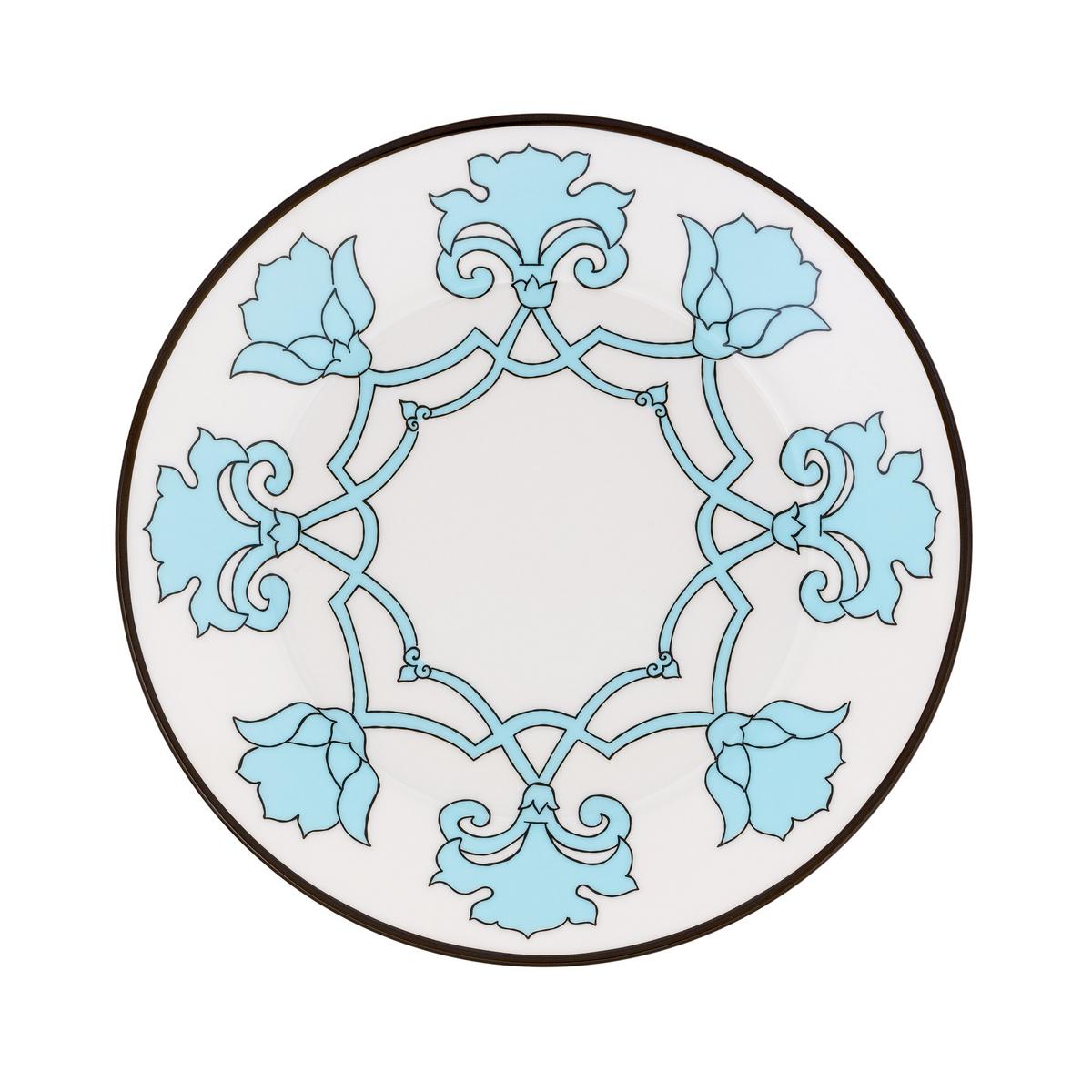 Elegante Feierlichkeit nach indischem Vorbild. Das Speiseservice "Jaipur Aqua" von Alberto Pinto ist von indischen Ornamenten und Motiven inspiriert. Die Teller aus weißem Limoges-Porzellan sind mit Chromolithografien von stilisierten hellblauen Ranken und Blumen bedruckt. Das Dekor erinnert an traditionelle Darstellungen der Lotusblume, dem Symbol für Erneuerung, Reinheit, Harmonie und Offenherzigkeit. Ein schwarzer Kontrast-Rand umrahmt das symmetrische Blumenprint und unterstreicht die abstrakte Bildhaftigkeit des Designs. Für ein einmaliges Tischgedeck komponieren Sie Ihre persönliche Farbharmonie mit "Jaipur Aqua" und den weiteren Farben der "Jaipur" Kollektion und stapeln sie wie ein Mandala.
