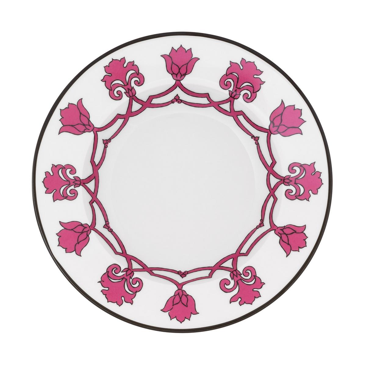 Elegante Feierlichkeit nach indischem Vorbild. Das Speiseservice "Jaipur Pink" von Alberto Pinto ist von indischen Ornamenten und Motiven inspiriert. Die Teller aus weißem Limoges-Porzellan sind mit Chromolithografien von stilisierten, rosaroten Ranken und Blumen bedruckt. Das Dekor erinnert an traditionelle Darstellungen der Lotusblume, dem Symbol für Erneuerung, Reinheit, Harmonie und Offenherzigkeit. Ein schwarzer Kontrast-Rand umrahmt das symmetrische Blumenprint und unterstreicht die abstrakte Bildhaftigkeit des Designs. Für ein einmaliges Tischgedeck komponieren Sie Ihre persönliche Farbharmonie mit "Jaipur Pink" und den weiteren Farben der "Jaipur" Kollektion und stapeln sie wie ein Mandala.