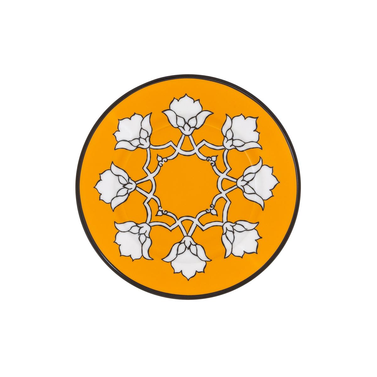 Elegante Feierlichkeit nach indischem Vorbild. Das Speiseservice "Jaipur Yellow" von Alberto Pinto ist von indischen Ornamenten und Motiven inspiriert. Die Teller aus weißem Limoges-Porzellan sind mit Chromolithografien von stilisierten, lebhaft gelben Ranken und Blumen bedruckt. Das Dekor erinnert an traditionelle Darstellungen der Lotusblume, dem Symbol für Erneuerung, Reinheit, Harmonie und Offenherzigkeit. Ein schwarzer Kontrast-Rand umrahmt das symmetrische Blumenprint und unterstreicht die abstrakte Bildhaftigkeit des Designs. Für ein einmaliges Tischgedeck komponieren Sie Ihre persönliche Farbharmonie mit "Jaipur Yellow" und den weiteren Farben der "Jaipur" Kollektion und stapeln sie wie ein Mandala.