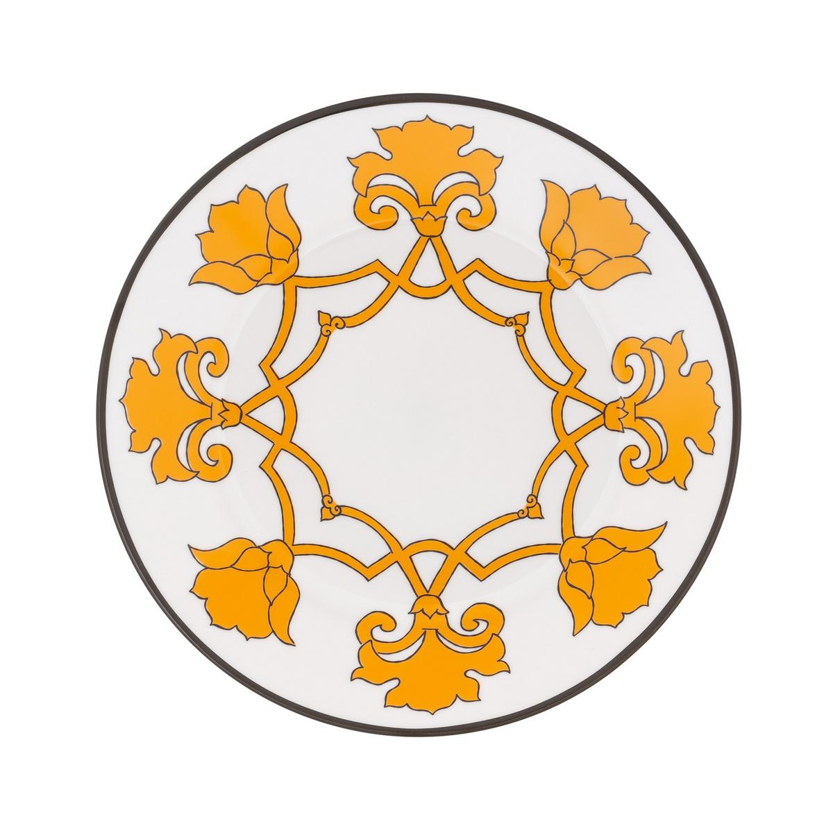 Elegante Feierlichkeit nach indischem Vorbild. Das Speiseservice "Jaipur Yellow" von Alberto Pinto ist von indischen Ornamenten und Motiven inspiriert. Die Teller aus weißem Limoges-Porzellan sind mit Chromolithografien von stilisierten, lebhaft gelben Ranken und Blumen bedruckt. Das Dekor erinnert an traditionelle Darstellungen der Lotusblume, dem Symbol für Erneuerung, Reinheit, Harmonie und Offenherzigkeit. Ein schwarzer Kontrast-Rand umrahmt das symmetrische Blumenprint und unterstreicht die abstrakte Bildhaftigkeit des Designs. Für ein einmaliges Tischgedeck komponieren Sie Ihre persönliche Farbharmonie mit "Jaipur Yellow" und den weiteren Farben der "Jaipur" Kollektion und stapeln sie wie ein Mandala.