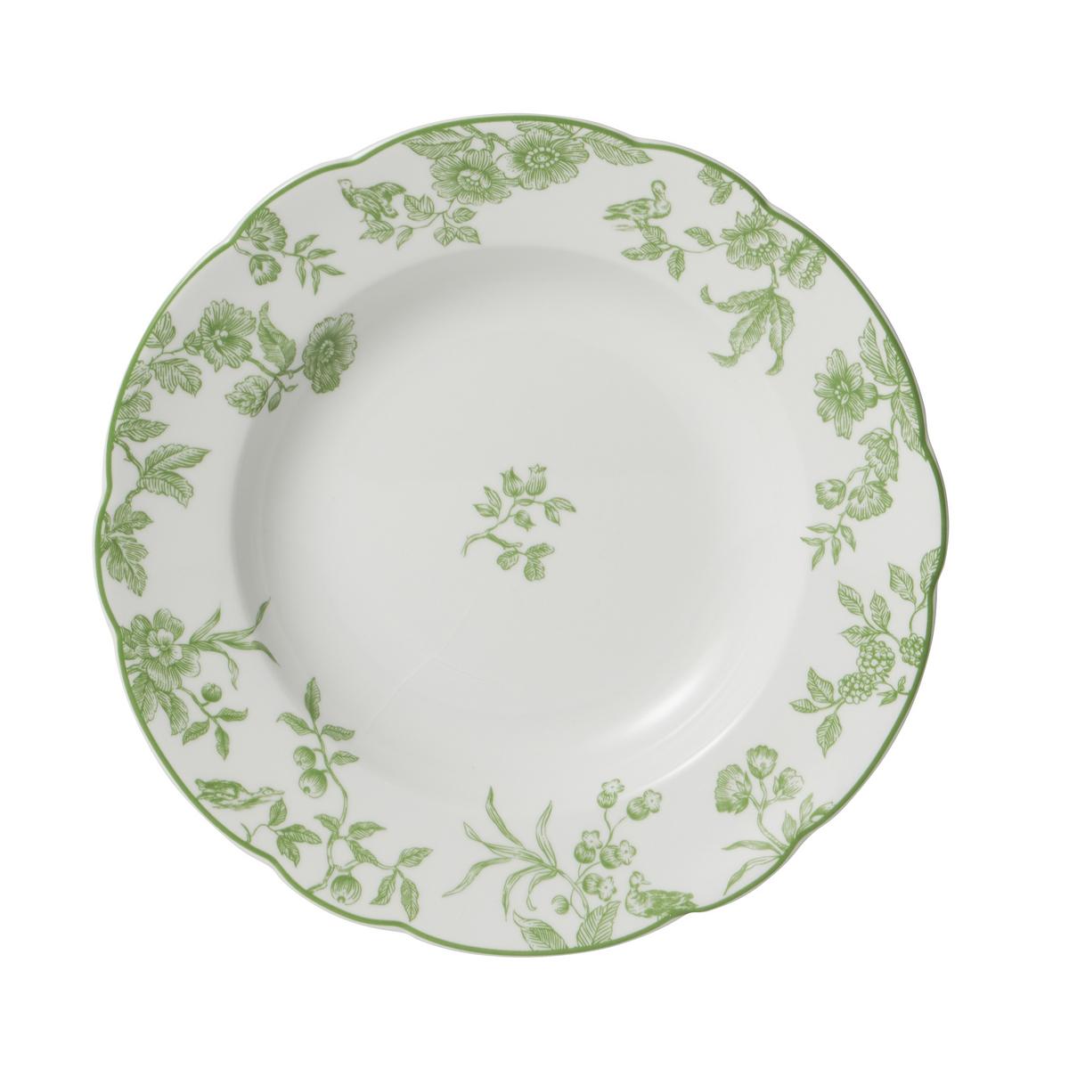 Inspiriert von den klassischen Formen des 18. Jahrhunderts, verleihen geschwungene Ränder und verspielte Details dem Service aus purem Limoges-Porzellan einen charmanten Vintage-Charakter. Die hellen, saftig grünen Dekore im Toile-de-Jouy-Stil zeigen liebenswerte Meisen, Reiher, Enten und Fasane, die sich im frischen Laub wilder Brombeeren tummeln. Ob Frühstück, Lunch, Kaffee und Kuchen oder Dinner, entführen Sie Ihre Gäste in ein anmutiges Idyll im modernen Landhausstil.