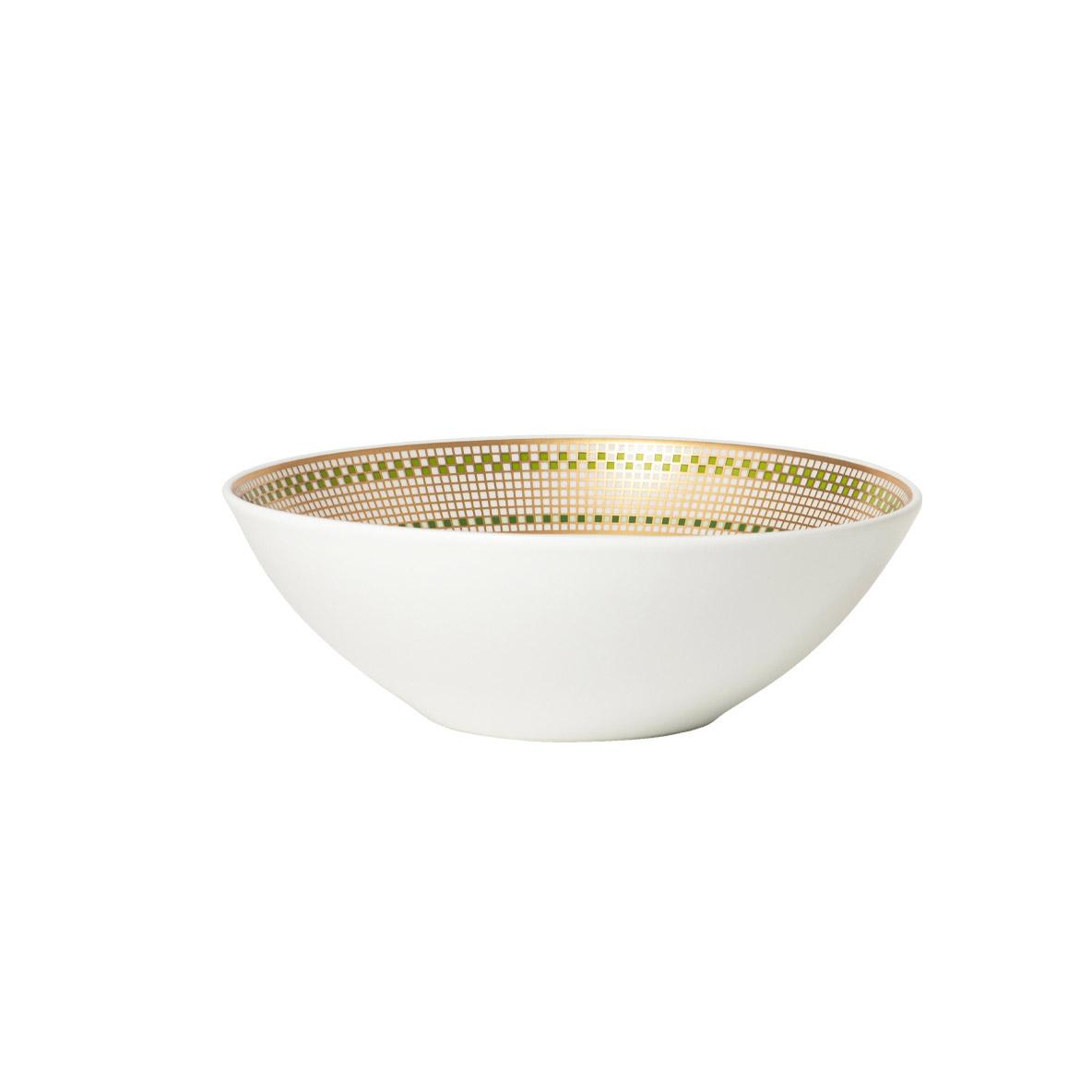 Wie ein antikes Mosaik setzt sich das Dekor der Kollektion aus kleinen Kacheln zusammen, die einem goldenen Gitternetz folgen. Raffiniert gesetzte Flächen in Hellgrün, Smaragdgrün und Schwarz formen geometrische Motive, die genauso gut aus einer römischen Villa als auch aus einem New Yorker Wolkenkratzer des frühen 20. Jahrhunderts stammen könnten. Klassizistisch trifft kubistisch – ein origineller Stilmix, der mit seiner präzisen Ausführung beeindruckt.
