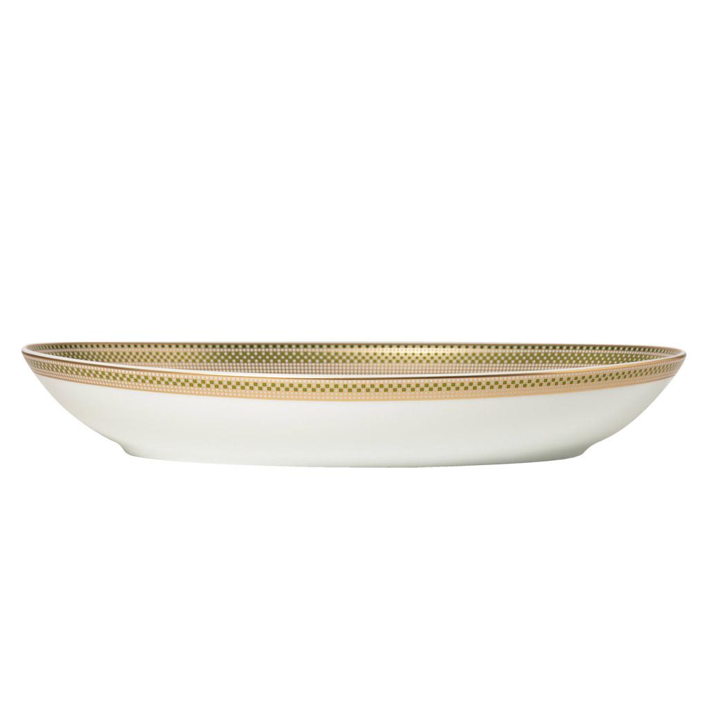 Wie ein antikes Mosaik setzt sich das Dekor der Kollektion aus kleinen Kacheln zusammen, die einem goldenen Gitternetz folgen. Raffiniert gesetzte Flächen in Hellgrün, Smaragdgrün und Schwarz formen geometrische Motive, die genauso gut aus einer römischen Villa als auch aus einem New Yorker Wolkenkratzer des frühen 20. Jahrhunderts stammen könnten. Klassizistisch trifft kubistisch – ein origineller Stilmix, der mit seiner präzisen Ausführung beeindruckt.